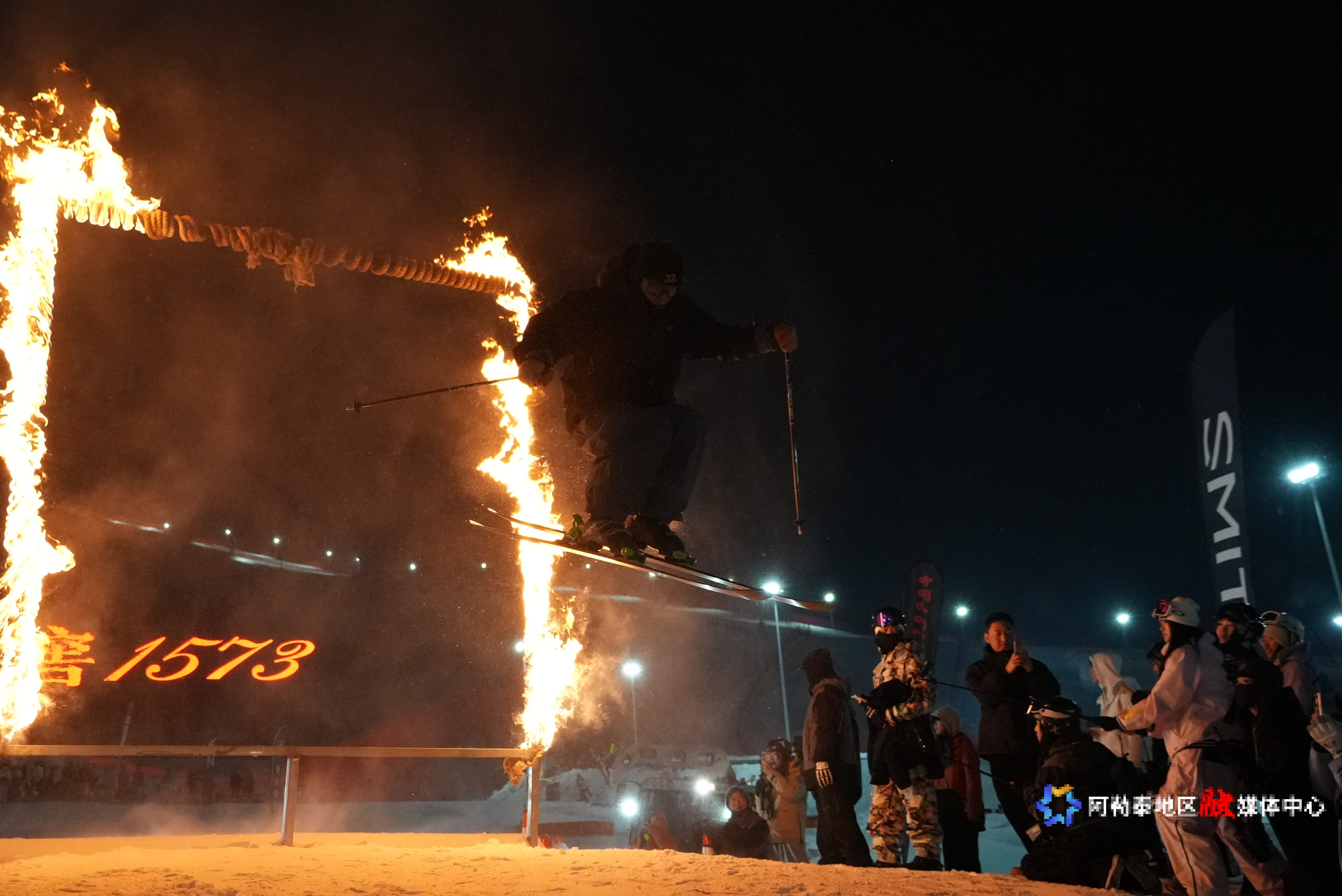 夜幕降临,活动现场人声鼎沸。随着跳台上代表着跨新年的方形火圈被点燃,一场别开生面的滑雪挑战正式拉开帷幕。跳动的火苗点燃了雪友们内心的热情与激情,他们身着专业滑雪装备,以各种高难度的花样招式跳跃穿过火圈,现场掌声雷动,欢呼声此起彼伏。