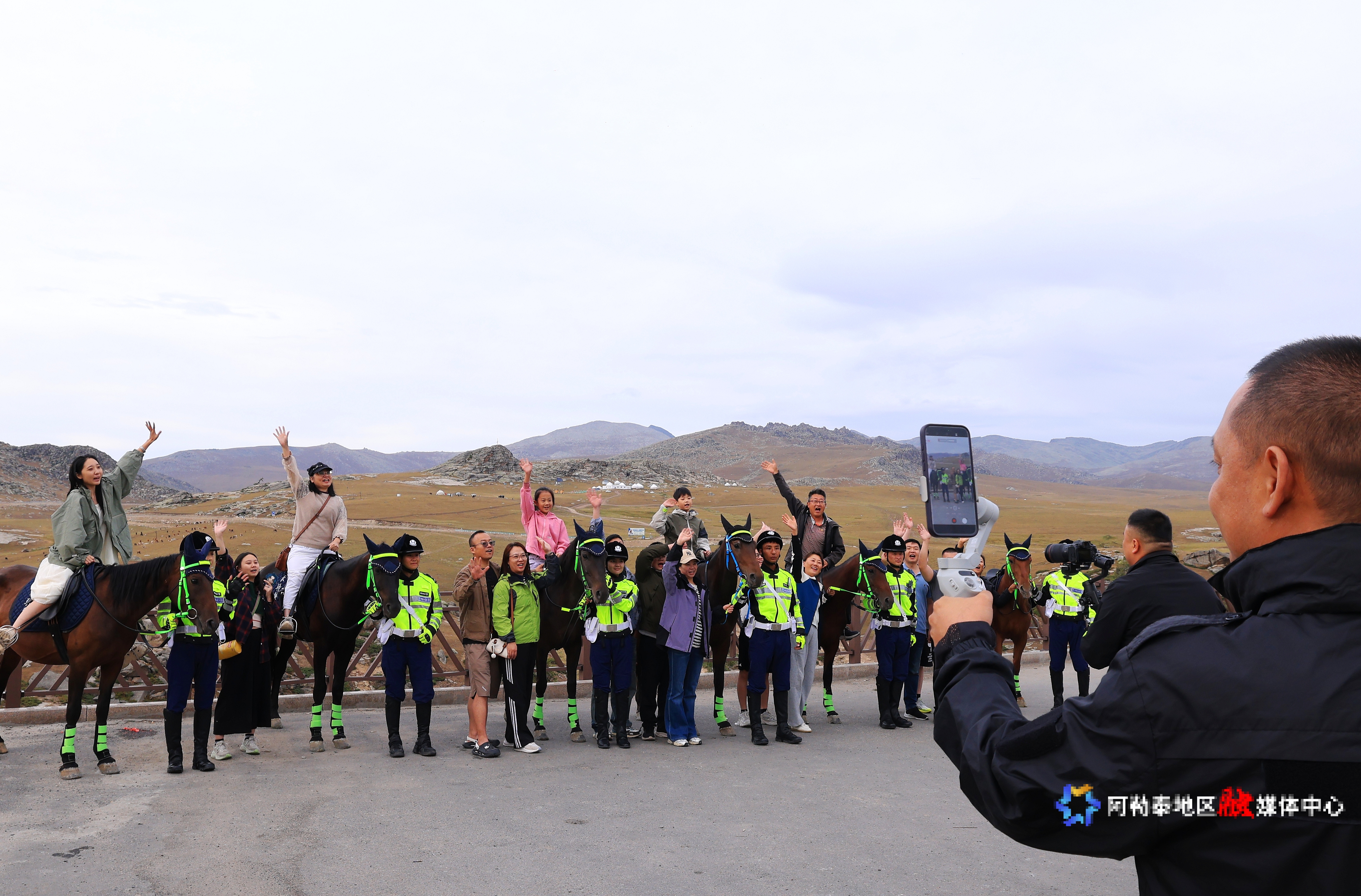 2025年8月16日,喀纳斯公安局骑警们在喀纳斯景区跟游客互动。记者 阿尔达克·拜斯汗 摄