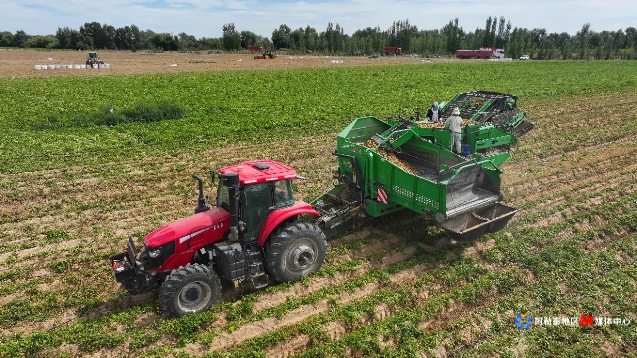 同样的科技场景也出现在巴勒塔村马铃薯基地,收获机穿梭田间,一个个饱满的马铃薯被快速采收;而萨尔塔克太村的12万亩食葵已化作金色花海,这背后离不开春夏时节县技工学校开展的“食葵高产栽培”系统化培训,让“科技范儿”助力丰产。