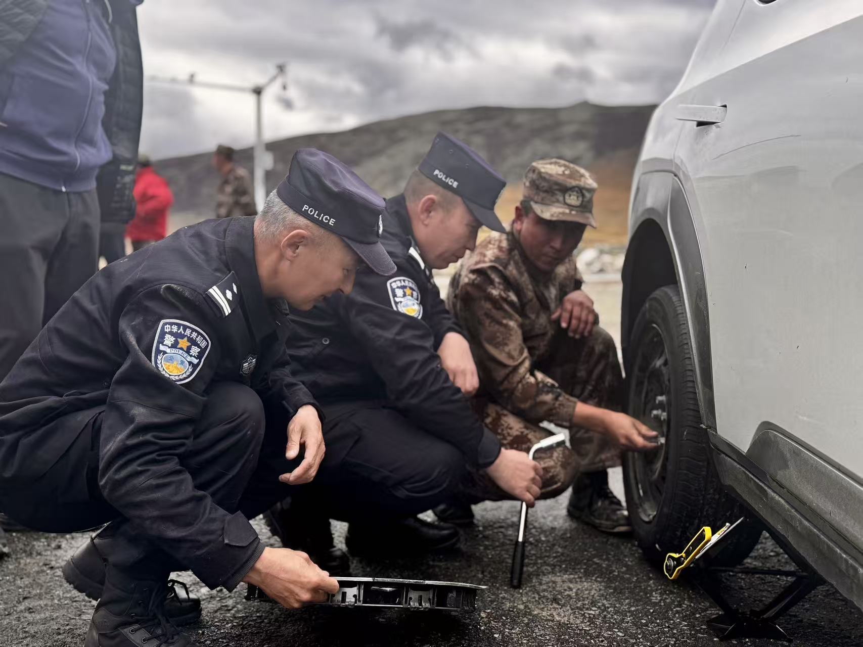 当日,阿勒泰边境管理支队拉斯特边境派出所民警在阿禾公路沿线巡逻时,发现一辆打着双闪的黑龙江牌照车辆停在路边,便上前了解情况。经询问得知,齐先生一家自驾至阿勒泰旅游观光,车辆在行驶中突然爆胎,因缺乏换胎经验,面对故障一筹莫展。