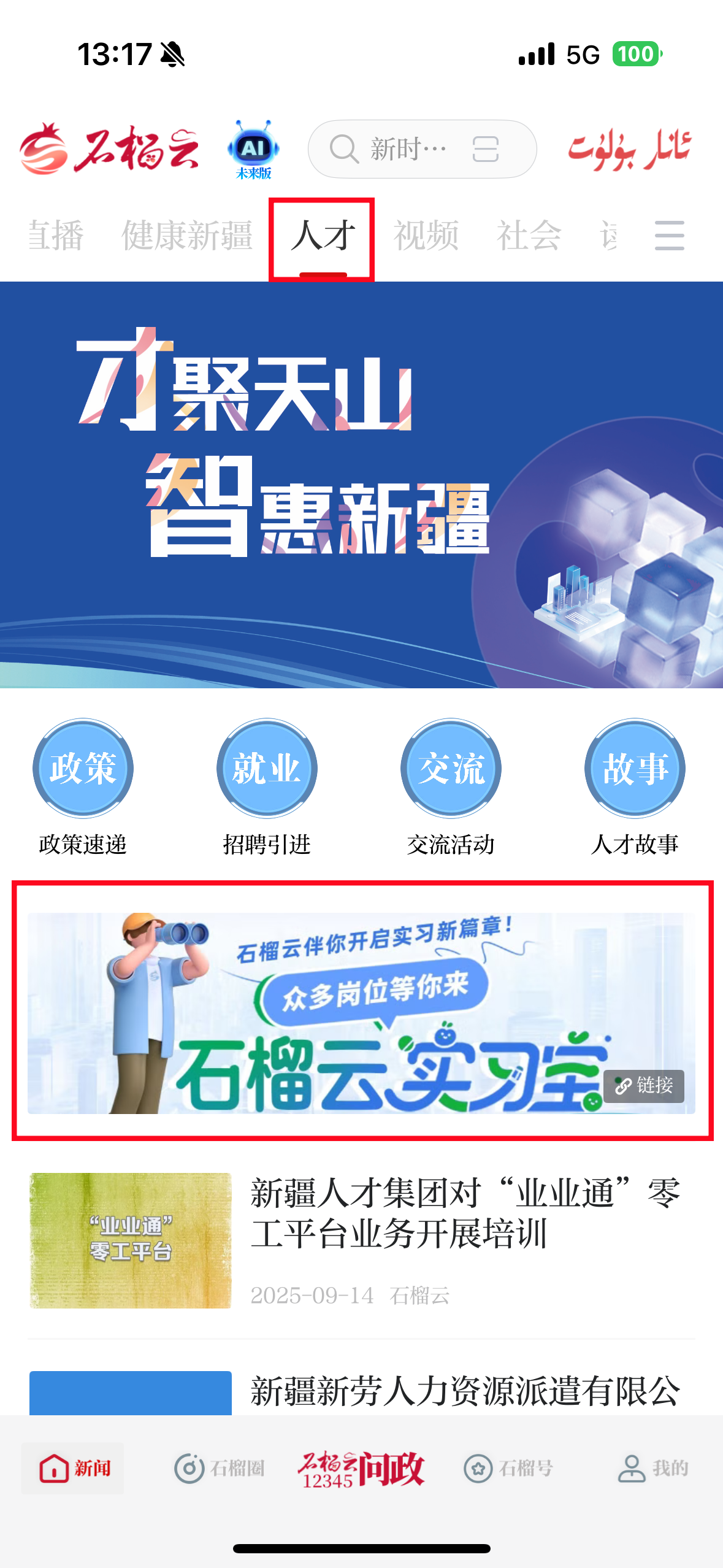 方式二:打开“石榴云”客户端→首页上方左滑至【人才】频道,点击“石榴云实习宝”链接进入主页。
