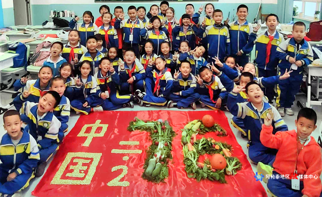 “用家乡种出的瓜果蔬菜拼出‘中国’两个字时,我心里特别激动!”阿勒泰市第二中学学生阿克纳尔·买热克捧着自己参与创作的作品说。