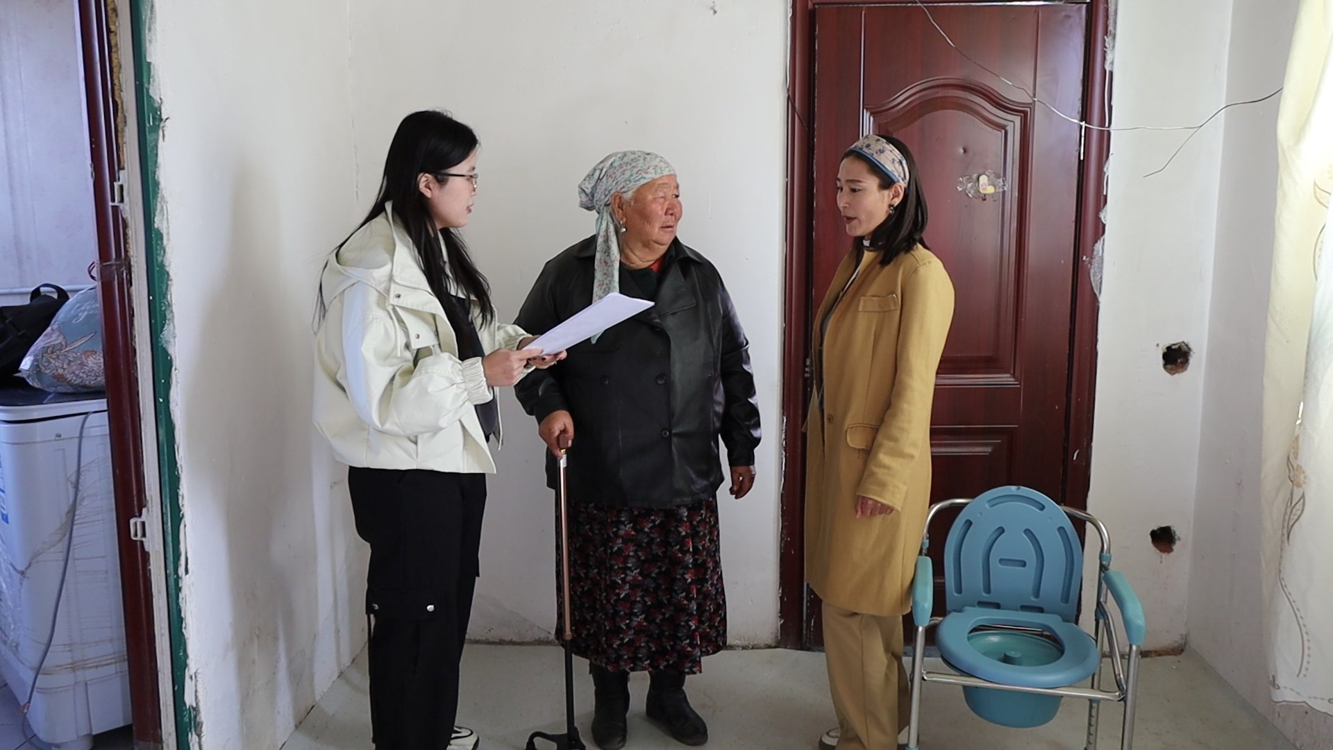 向老人发放四角手杖、浴便两用椅,并向老人说明此次适老化改造的政策内容。通讯员 宋湖拉·沙布尔江摄