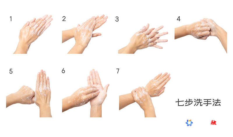 正确洗手的方式——七步洗手法(内、外、夹、弓、大、立、腕)