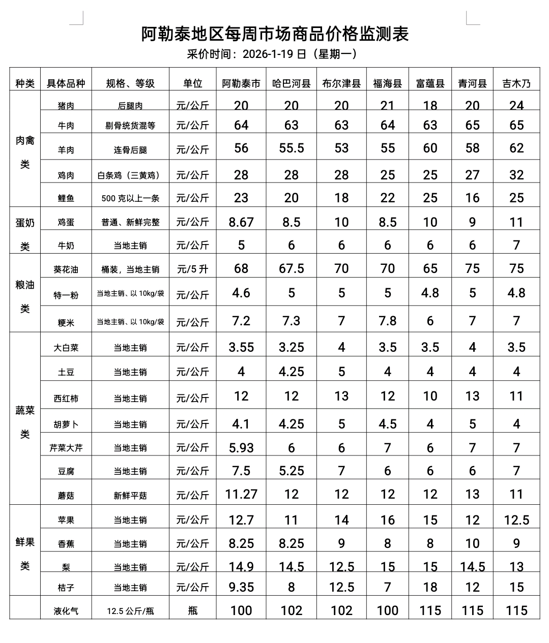 阿勒泰地区每周市场商品价格监测表