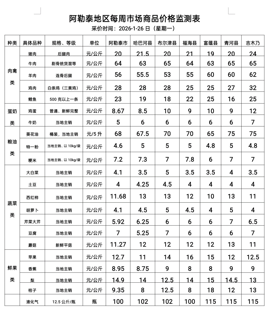 阿勒泰地区每周市场商品价格监测表