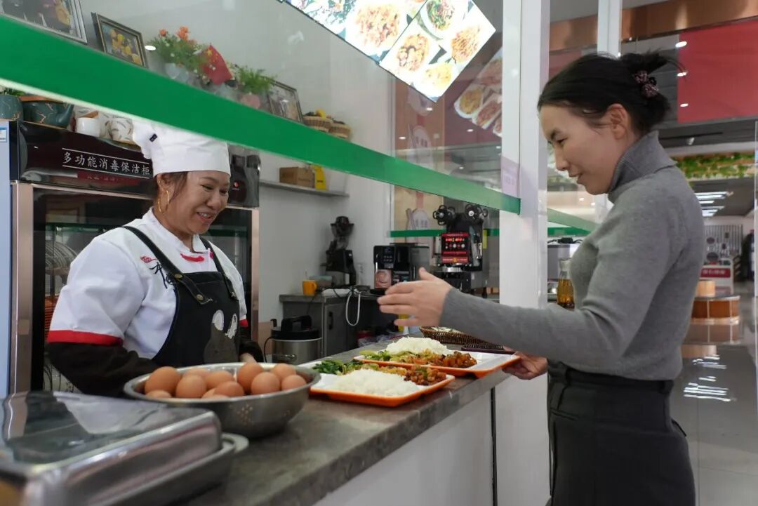 “阿姨,您来了!今天有您爱吃的羊肉面片和凉拌三丝,刚出锅,快找位置坐!”工作人员一边麻利盛饭,一边笑着和走进食堂的居民打招呼。