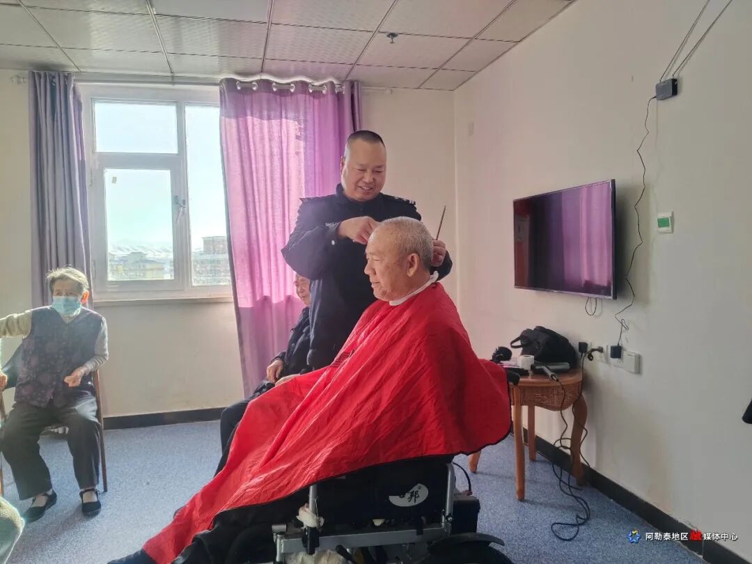 阿勒泰市公安局雪都义警工作站民警走进地区康养中心敬老院,为老人们义务理发。