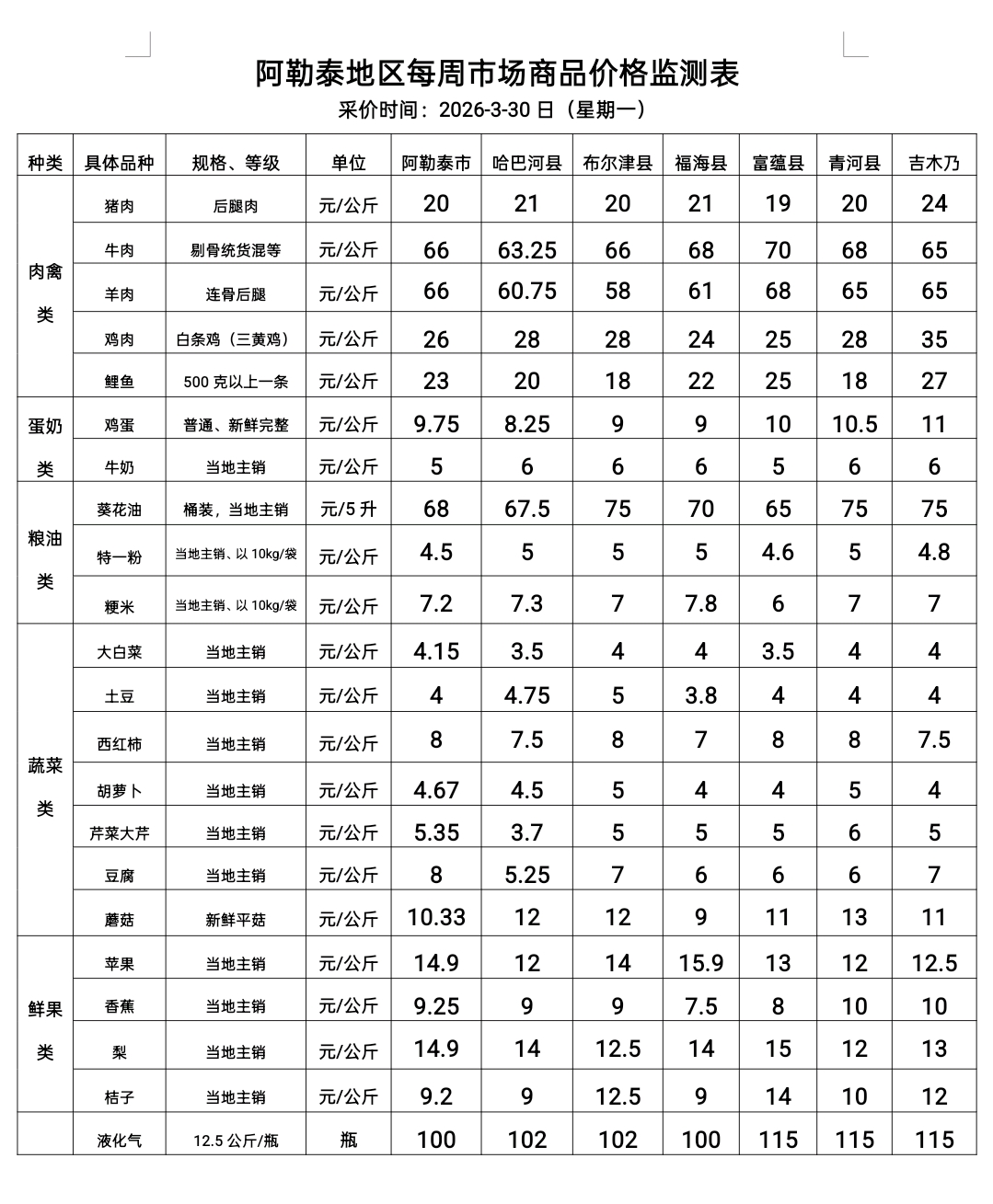 阿勒泰地区每周市场商品价格监测表