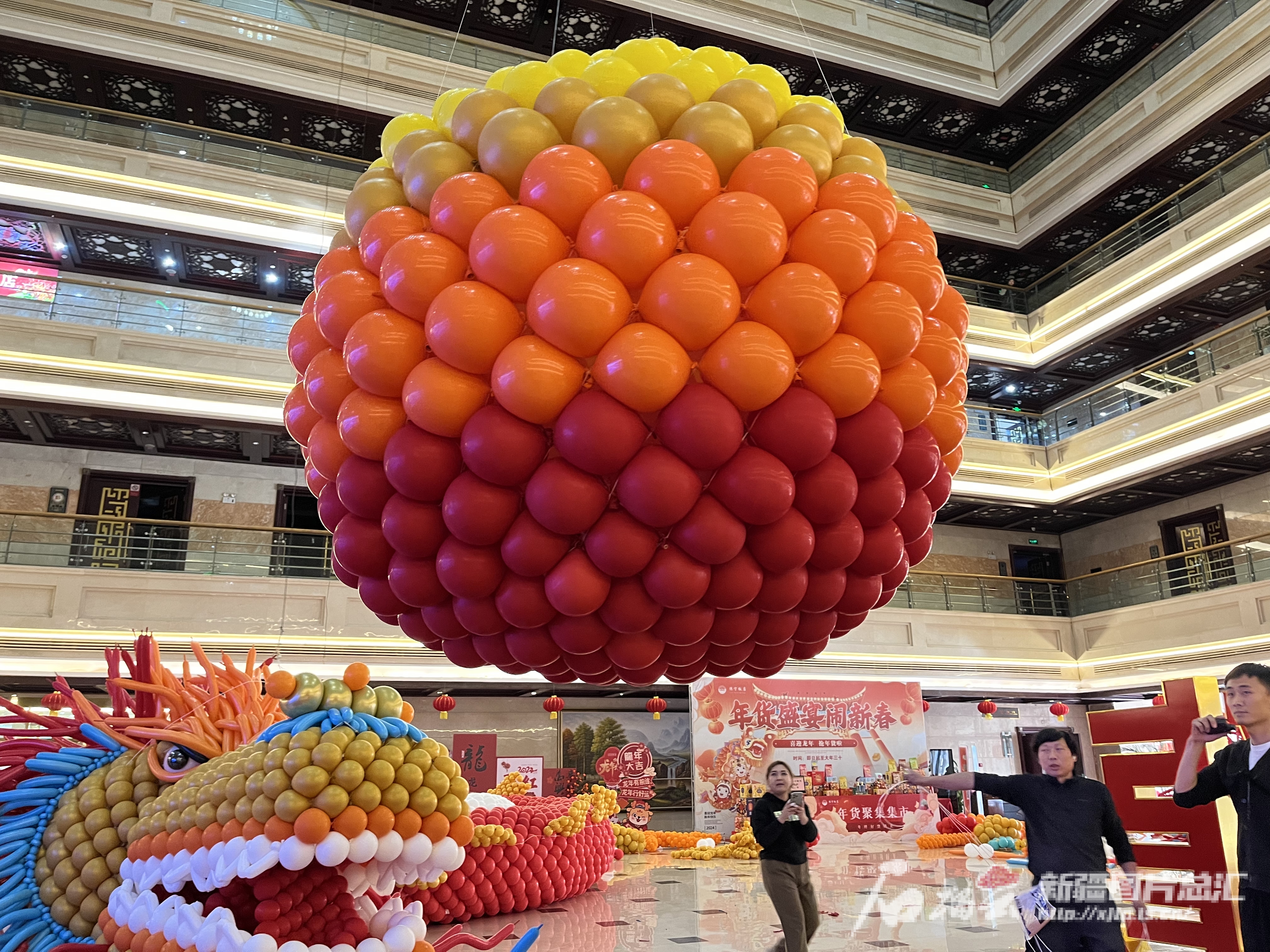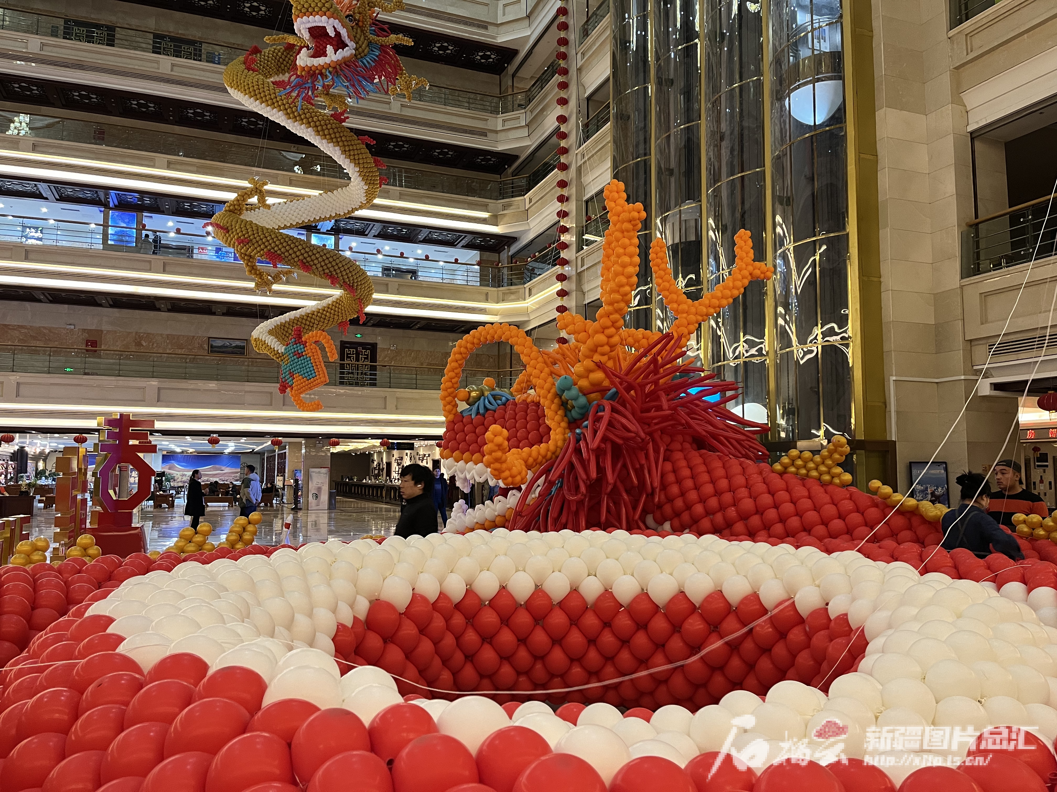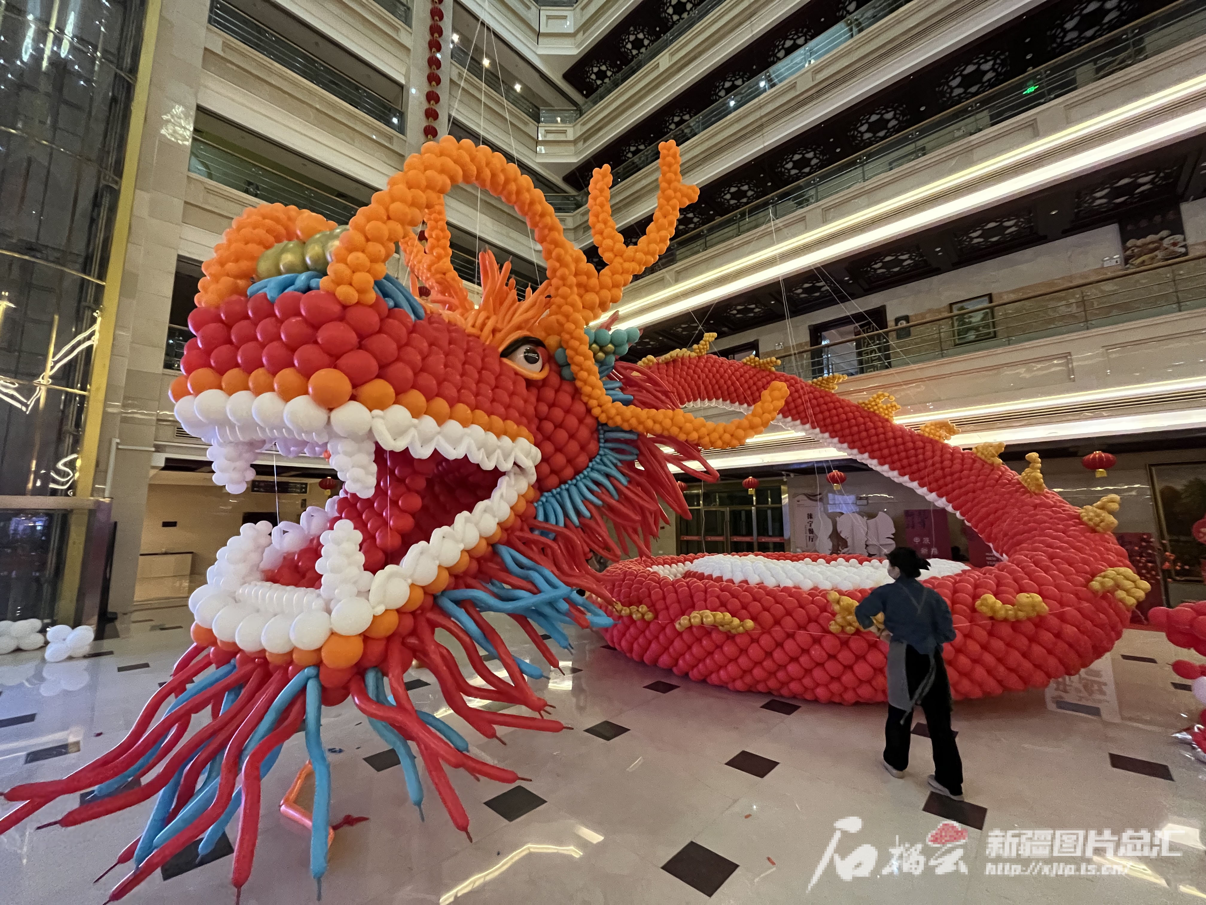 2月2日,在喀什市建设路的喀什徕宁饭店大厅,近10万只炫彩气球在多位“气球美陈师”手中,化作两条“龙气腾腾”的大龙,簇拥着“大龙珠”,腾空而起。