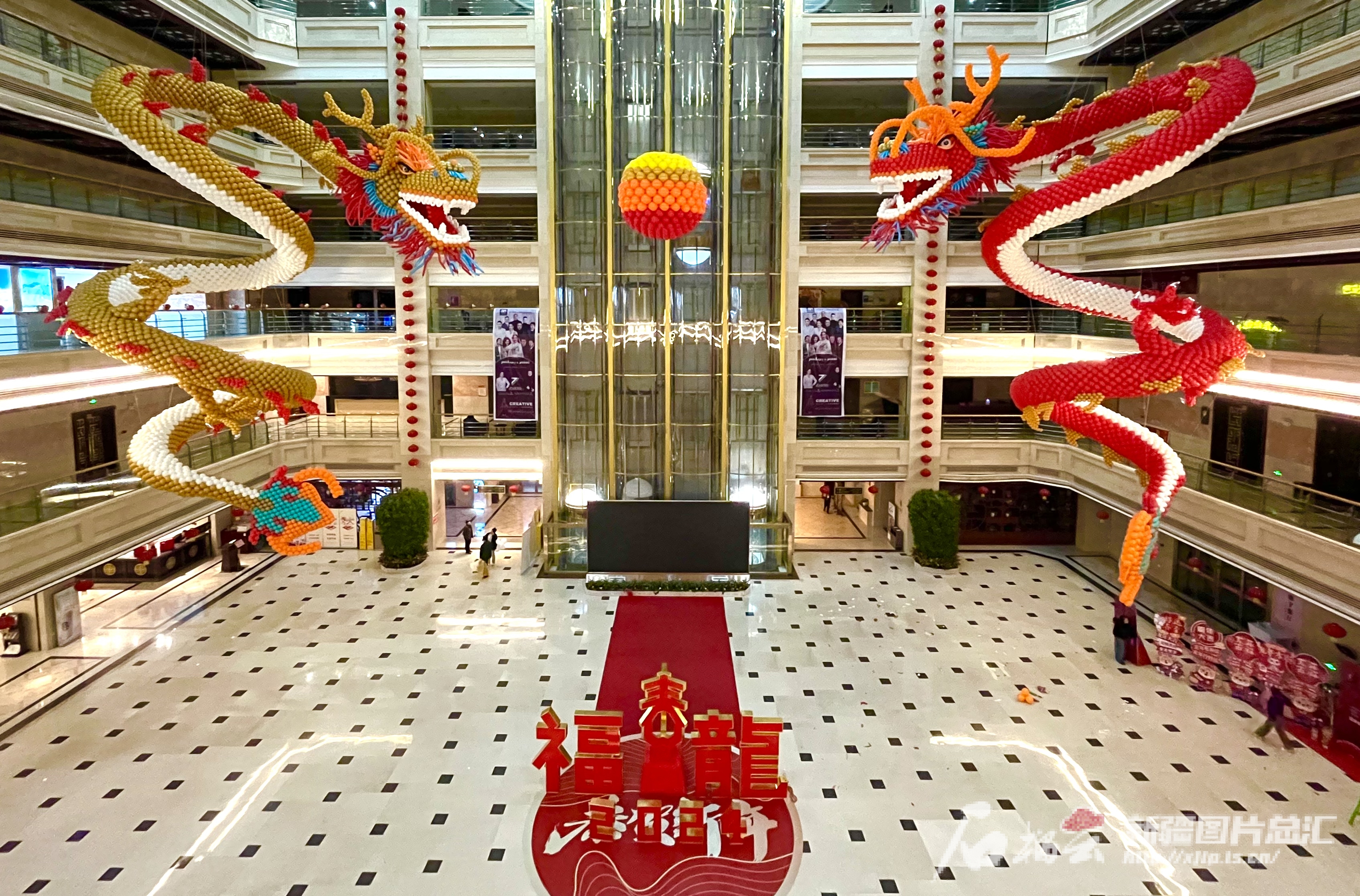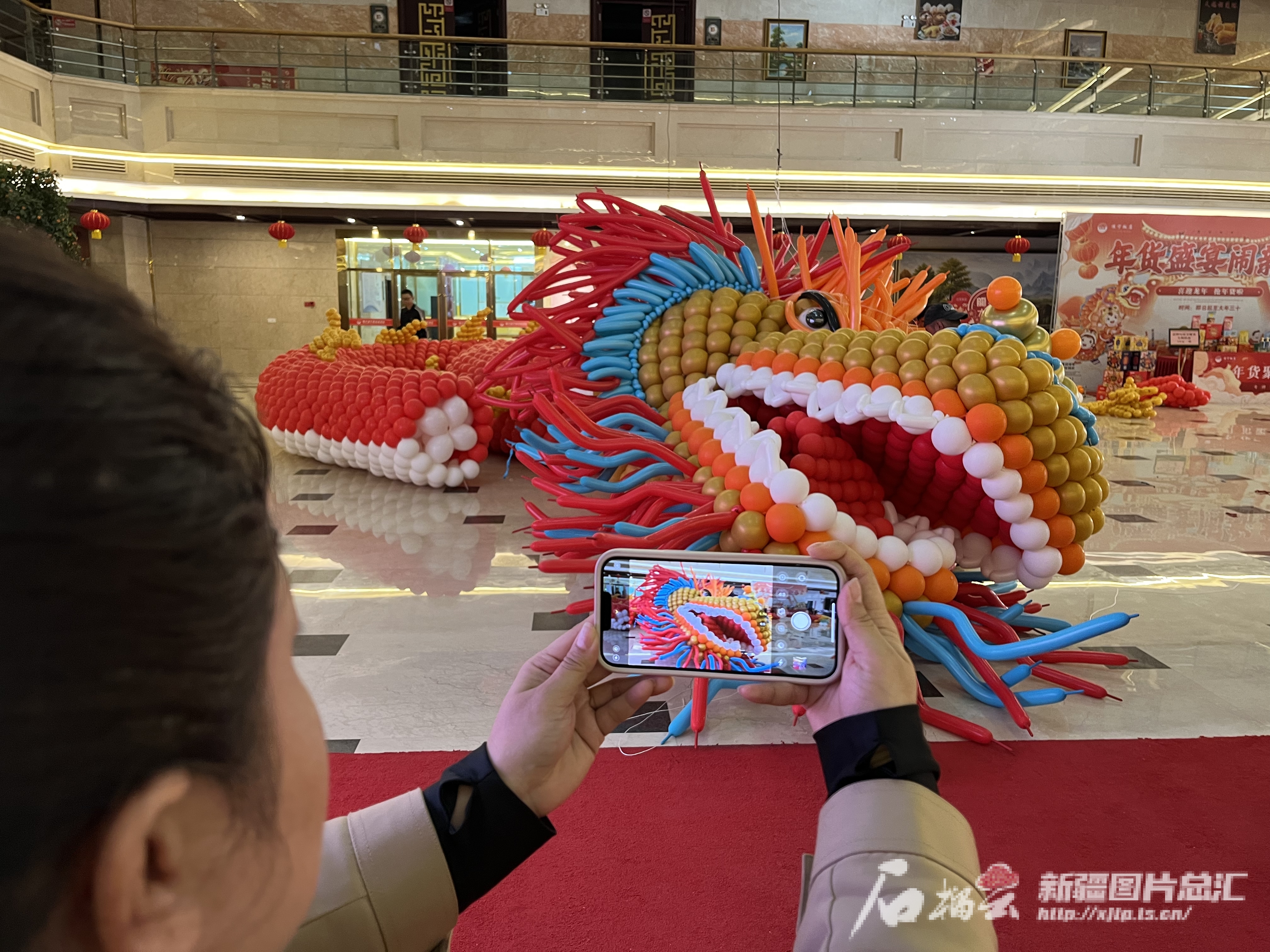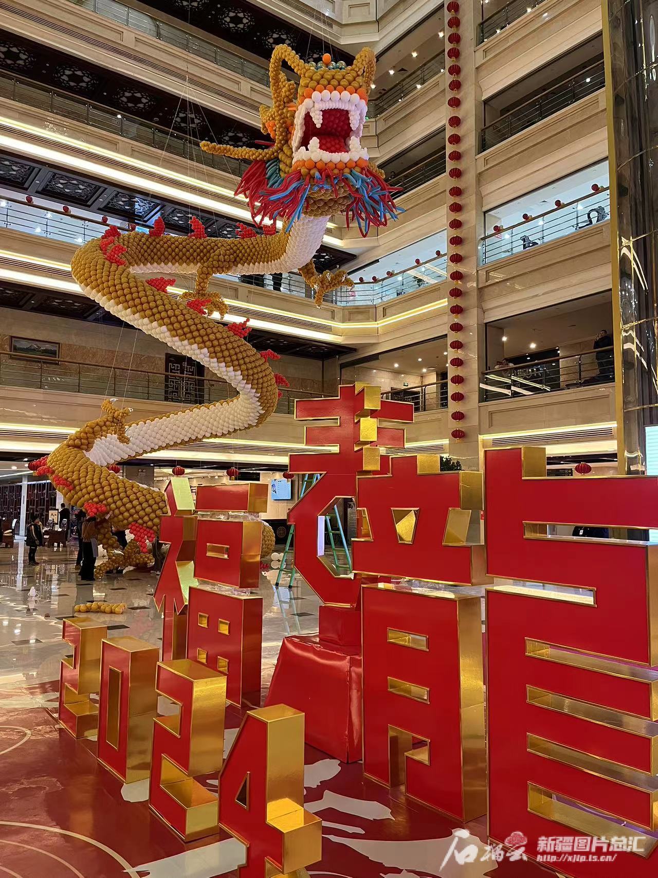 2月2日,在喀什市建设路的喀什徕宁饭店大厅,近10万只炫彩气球在多位“气球美陈师”手中,化作两条“龙气腾腾”的大龙,簇拥着“大龙珠”,腾空而起。