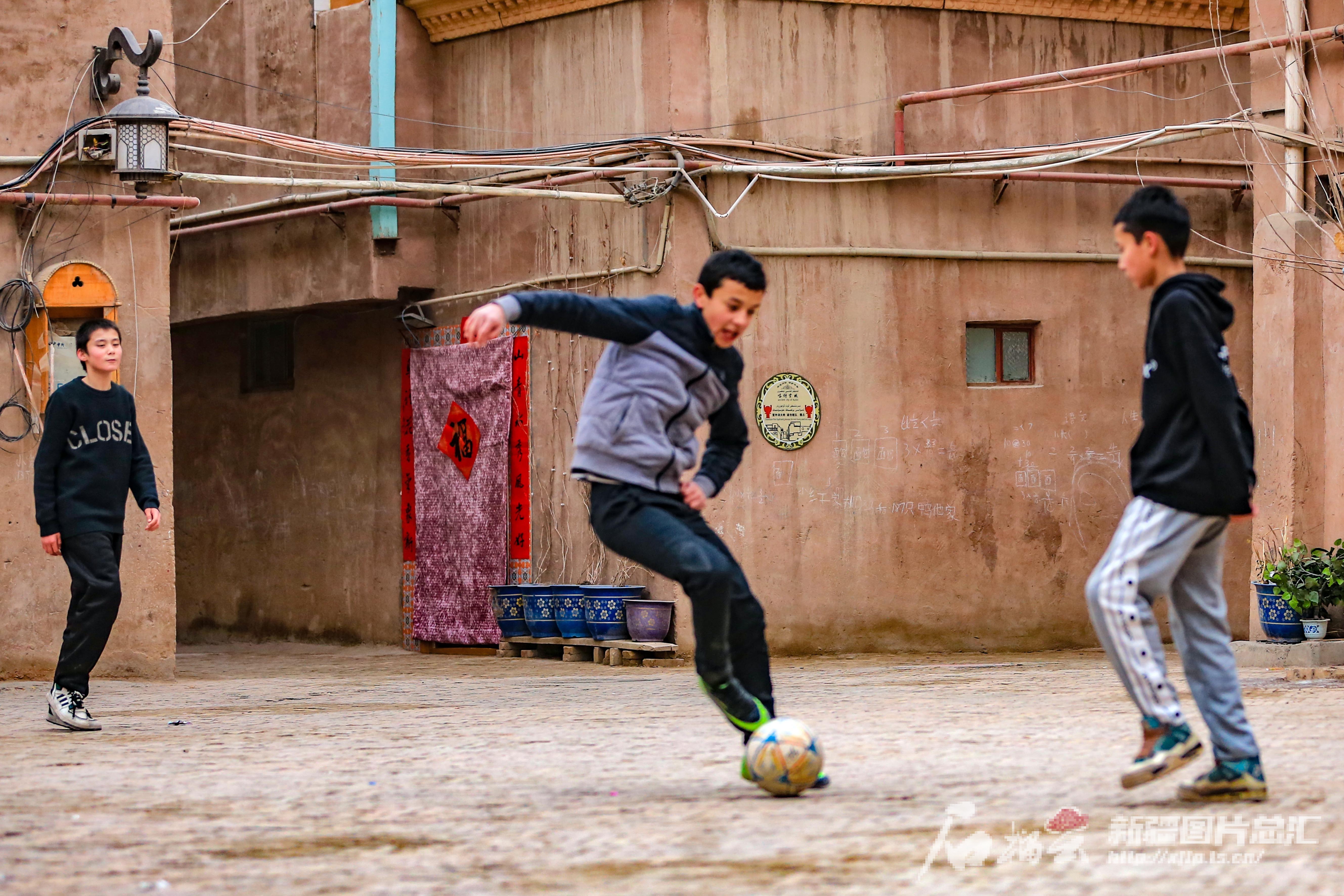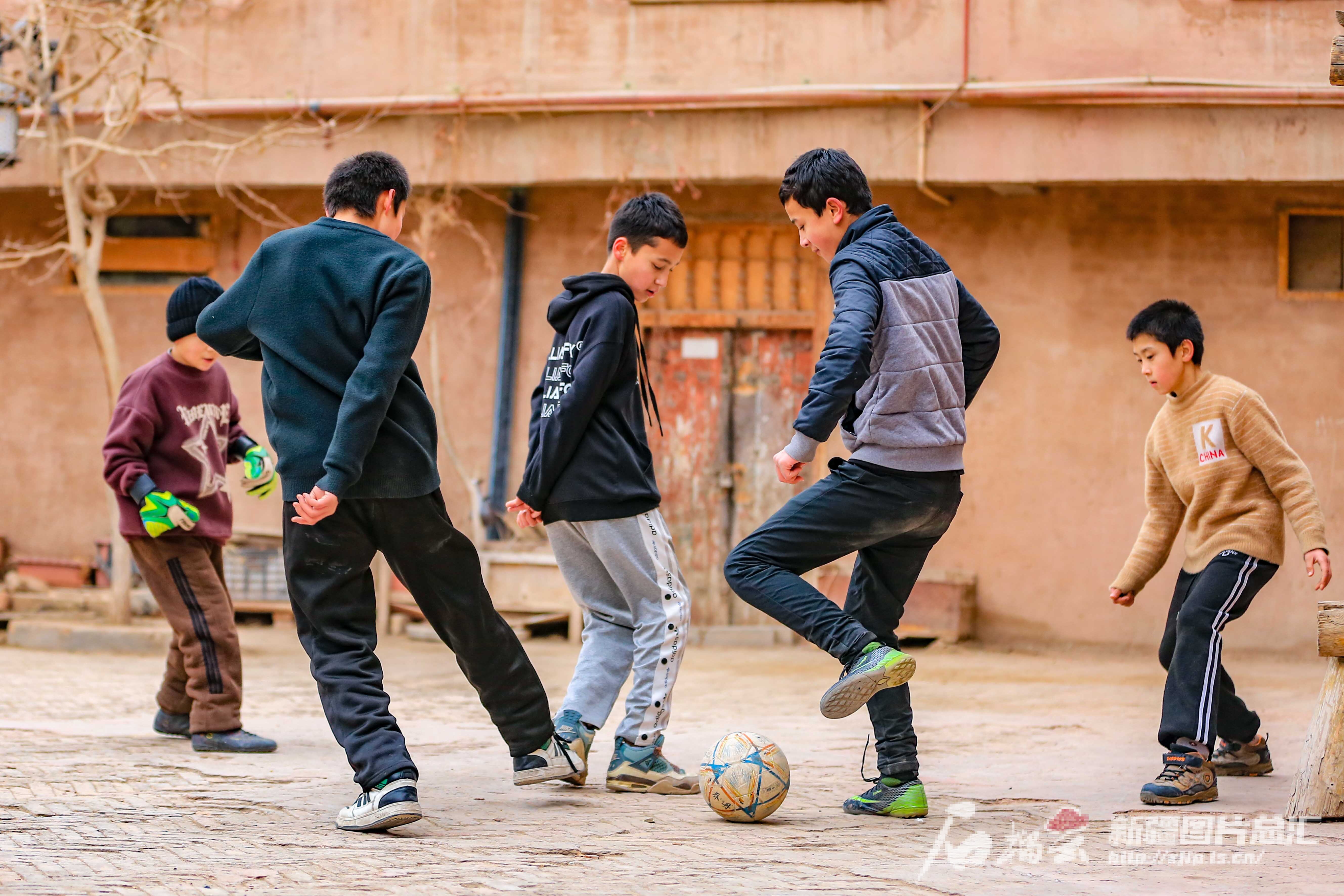 2月5日,小朋友们在喀什古城街巷中踢球。石榴云/新疆日报记者 蔡增乐摄