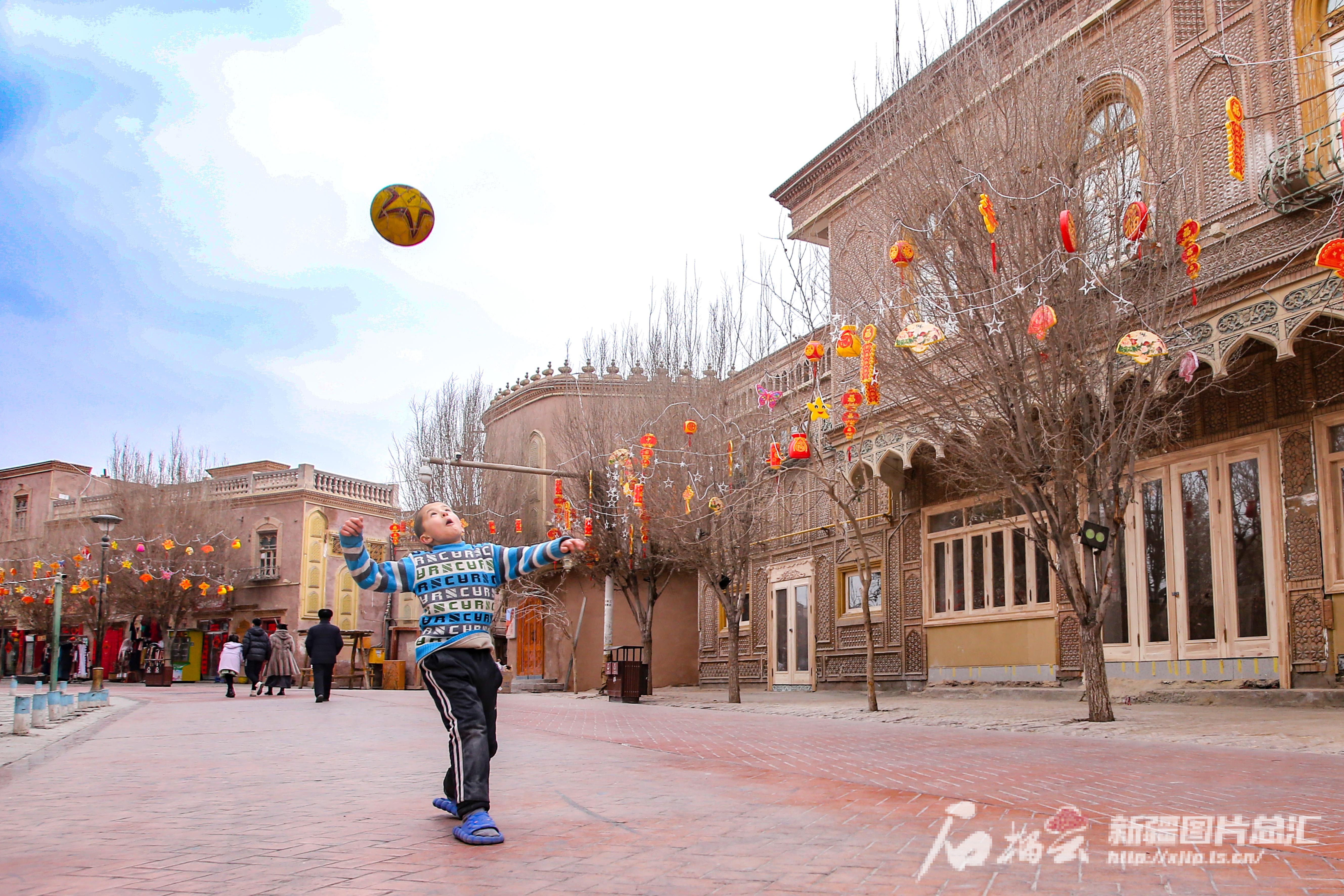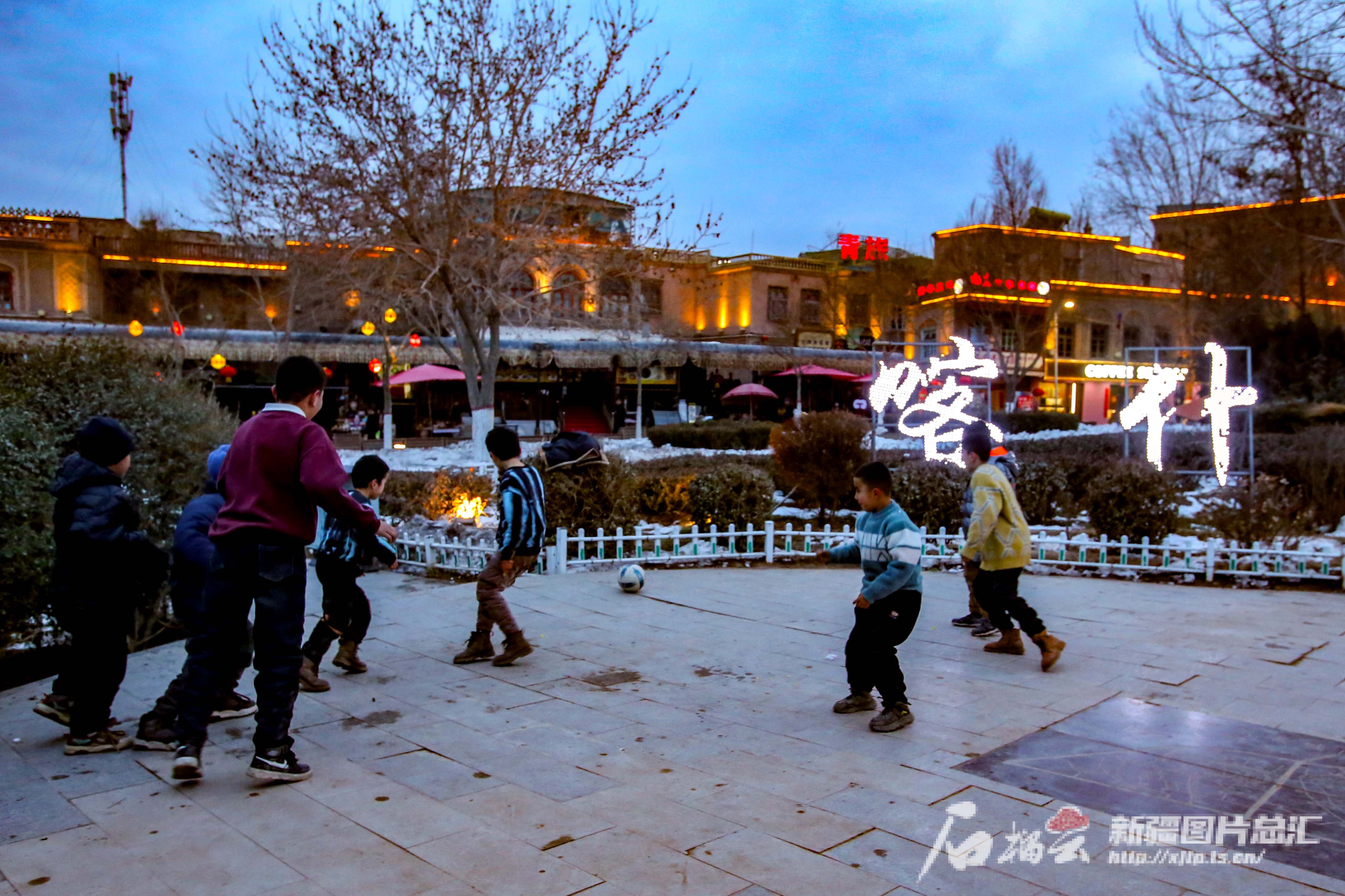 2月5日,小朋友们在喀什古城景区的小广场上踢球。石榴云/新疆日报记者 蔡增乐摄