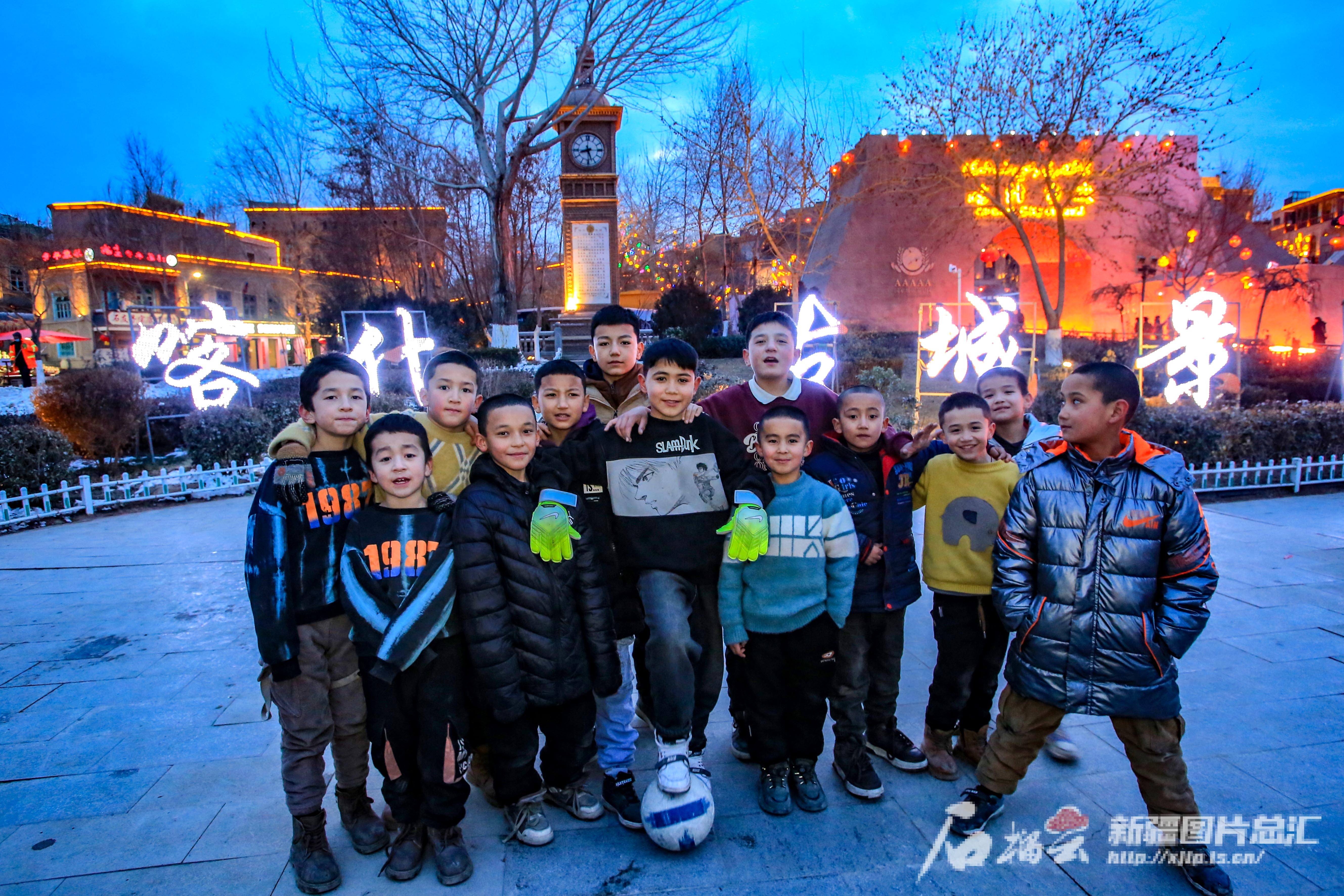 2月5日,踢球的小朋友们在喀什古城景区的小广场上合影。
