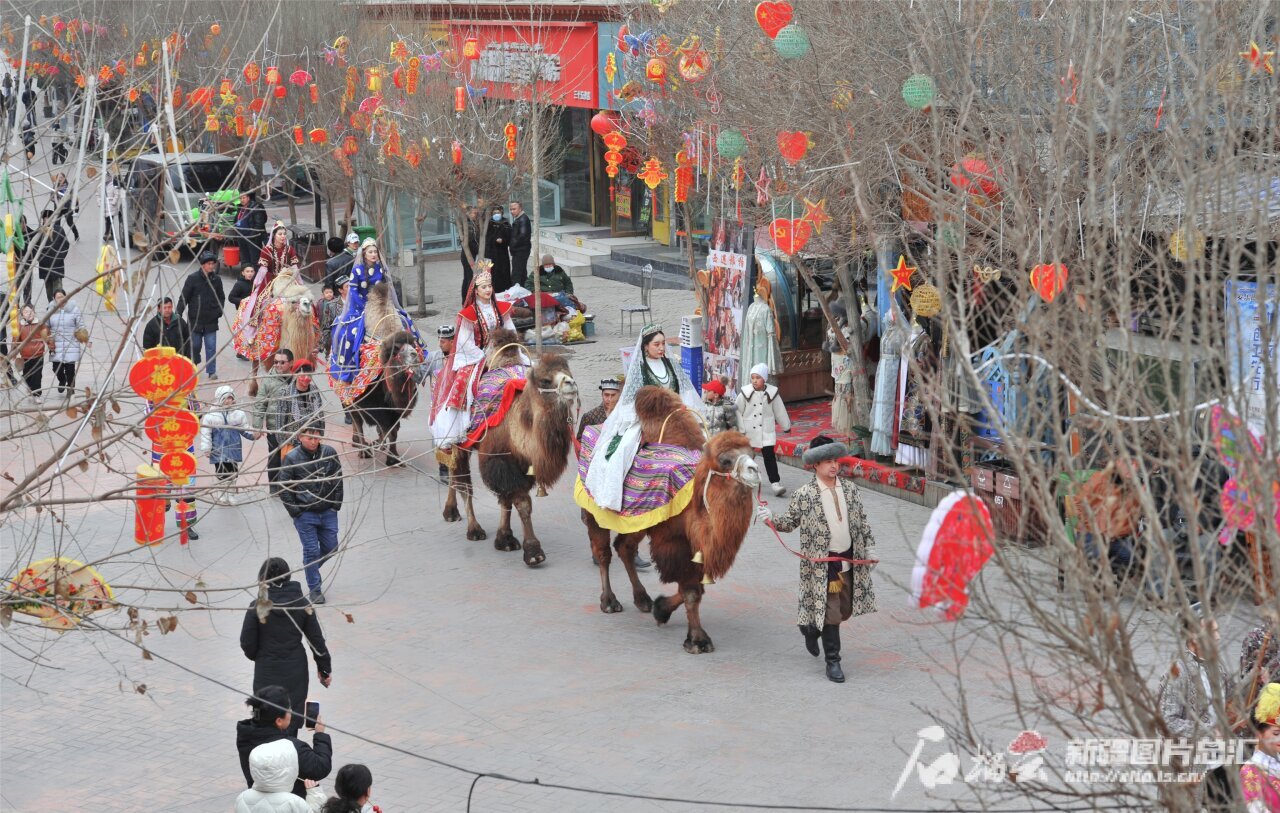 2月9日,游客在喀什古城景区观看丝路驼队表演,感受当地浓浓的年味。