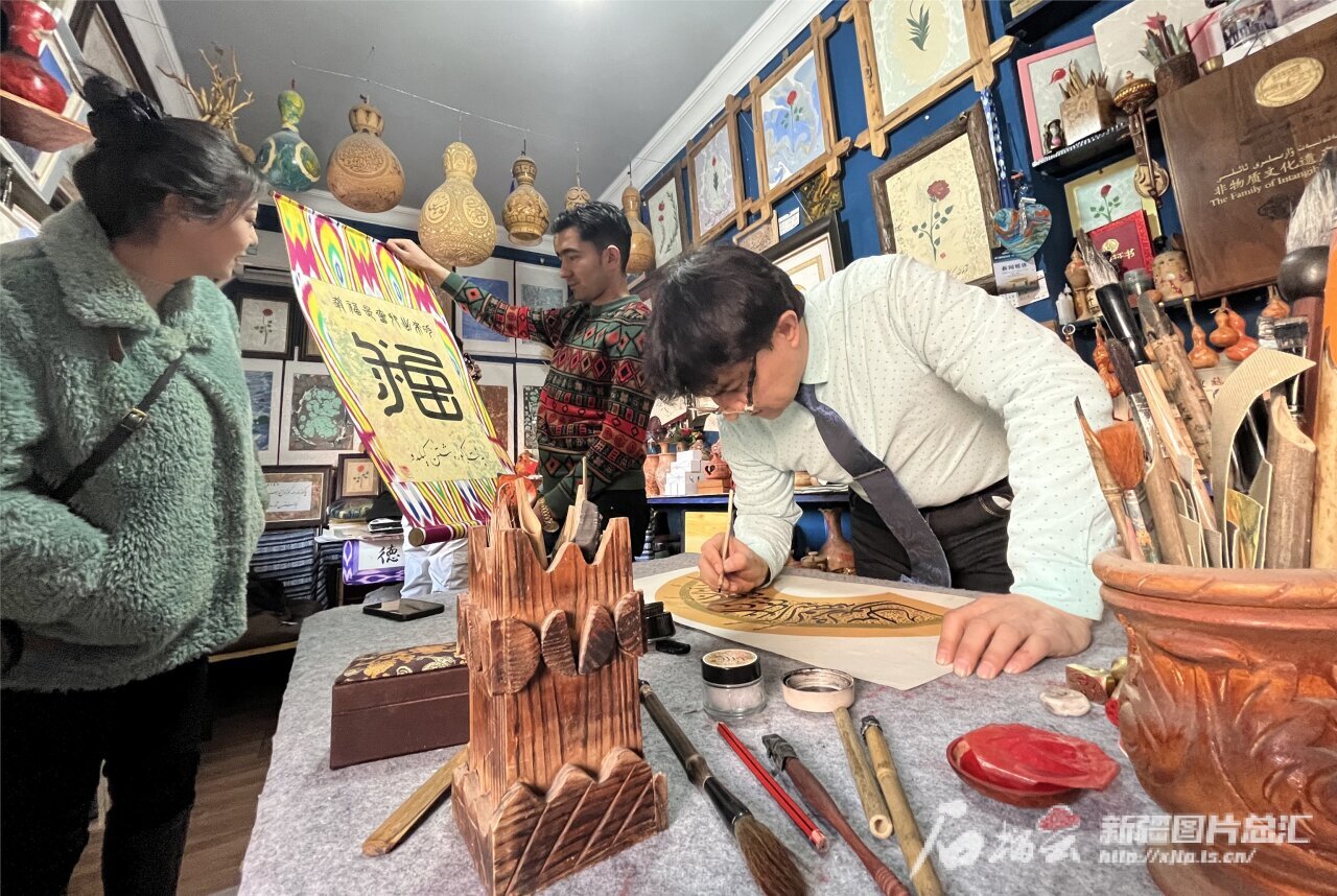2月9日,自治区级维吾尔文书法非物质文化遗产项目传承人库尔班江·肉孜在喀什古城景区里的工作室为游客书写定制的迎新年书法作品。