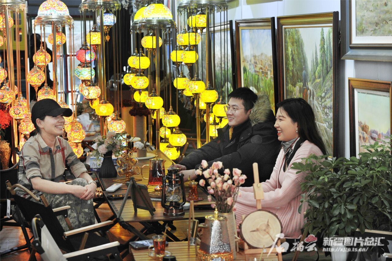 2月9日,游客在喀什古城景区油画街热比亚·买海提的画廊里品茶赏画,感受当地浓浓的年味。