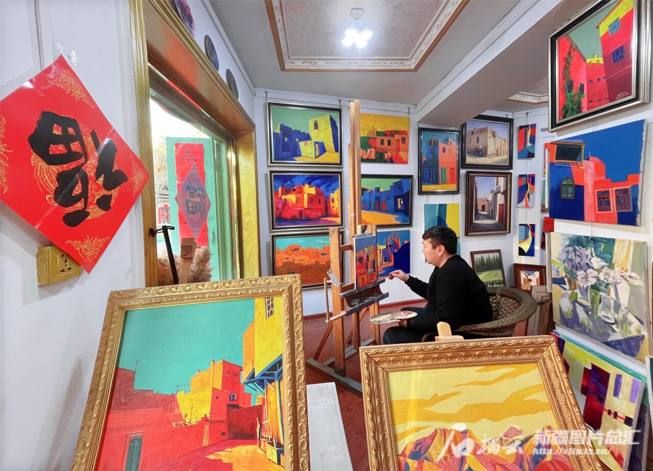 2月9日,在喀什古城景区油画街里的画家阿卜杜凯尤木·阿卜杜克热木在画廊创作为游客定制的古城题材油画作品。