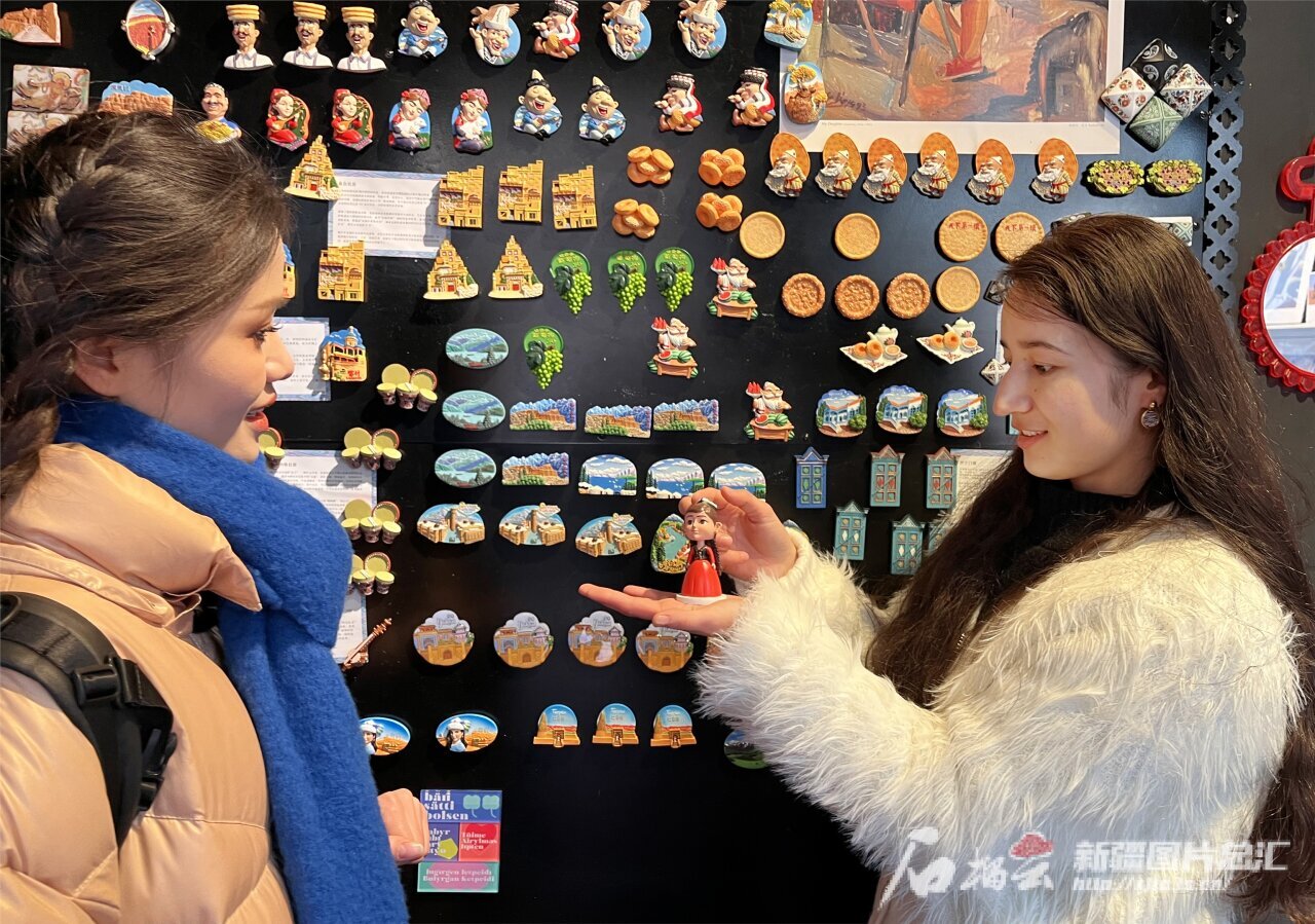 2月9日,游客在喀什古城景区文创店里选购具有当地文化元素的旅游纪念品。