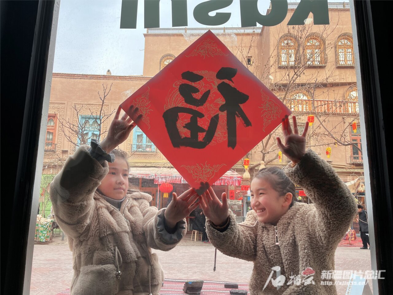 2月9日,小朋友在喀什古城景区帮父母在店铺橱窗上贴福字。石榴云/新疆日报记者 约提克尔·尼加提摄