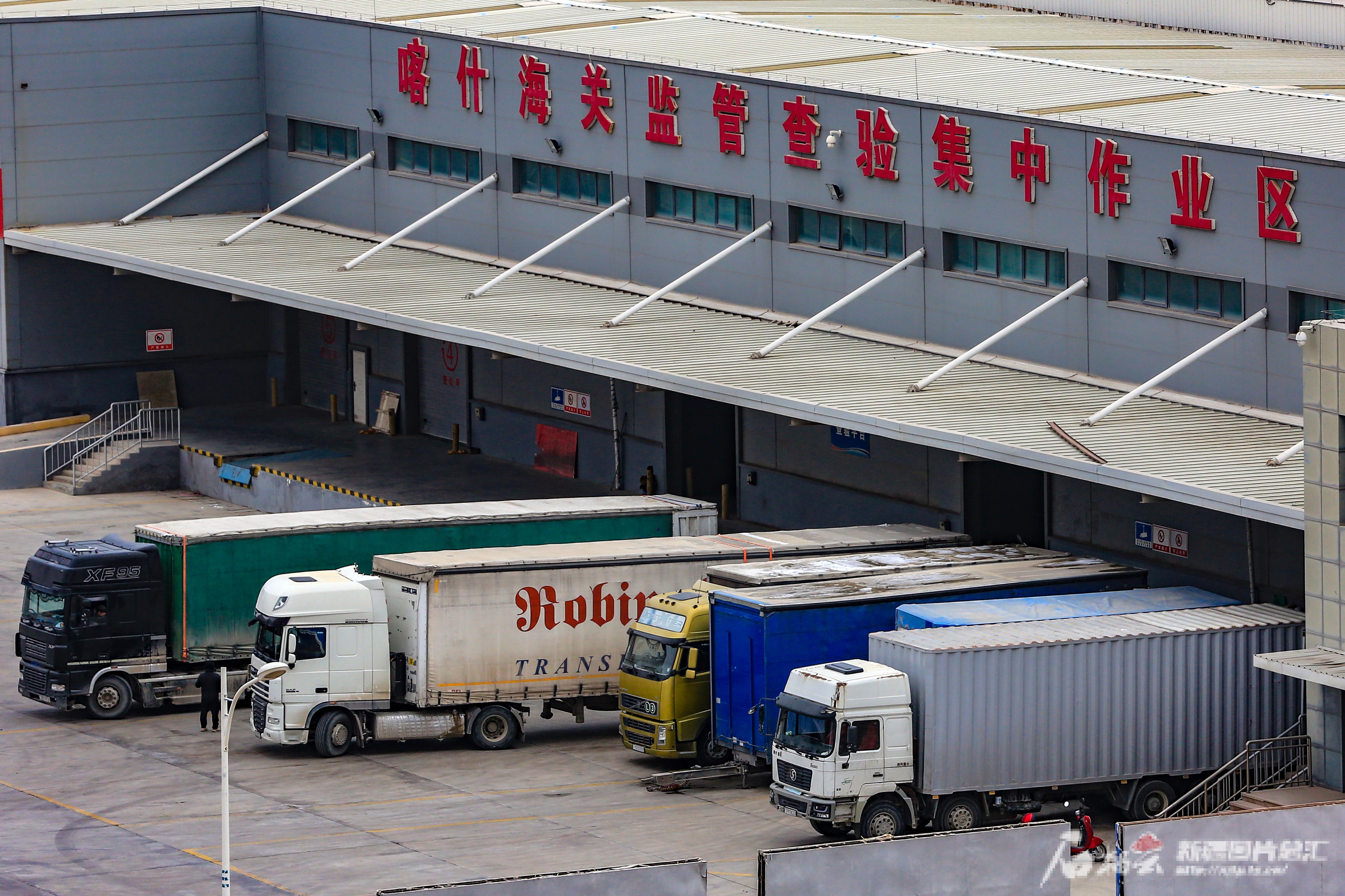 2月6日,货运卡车在喀什综合保税区海关监管检验作业区进行检验作业。石榴云/新疆日报记者 蔡增乐摄