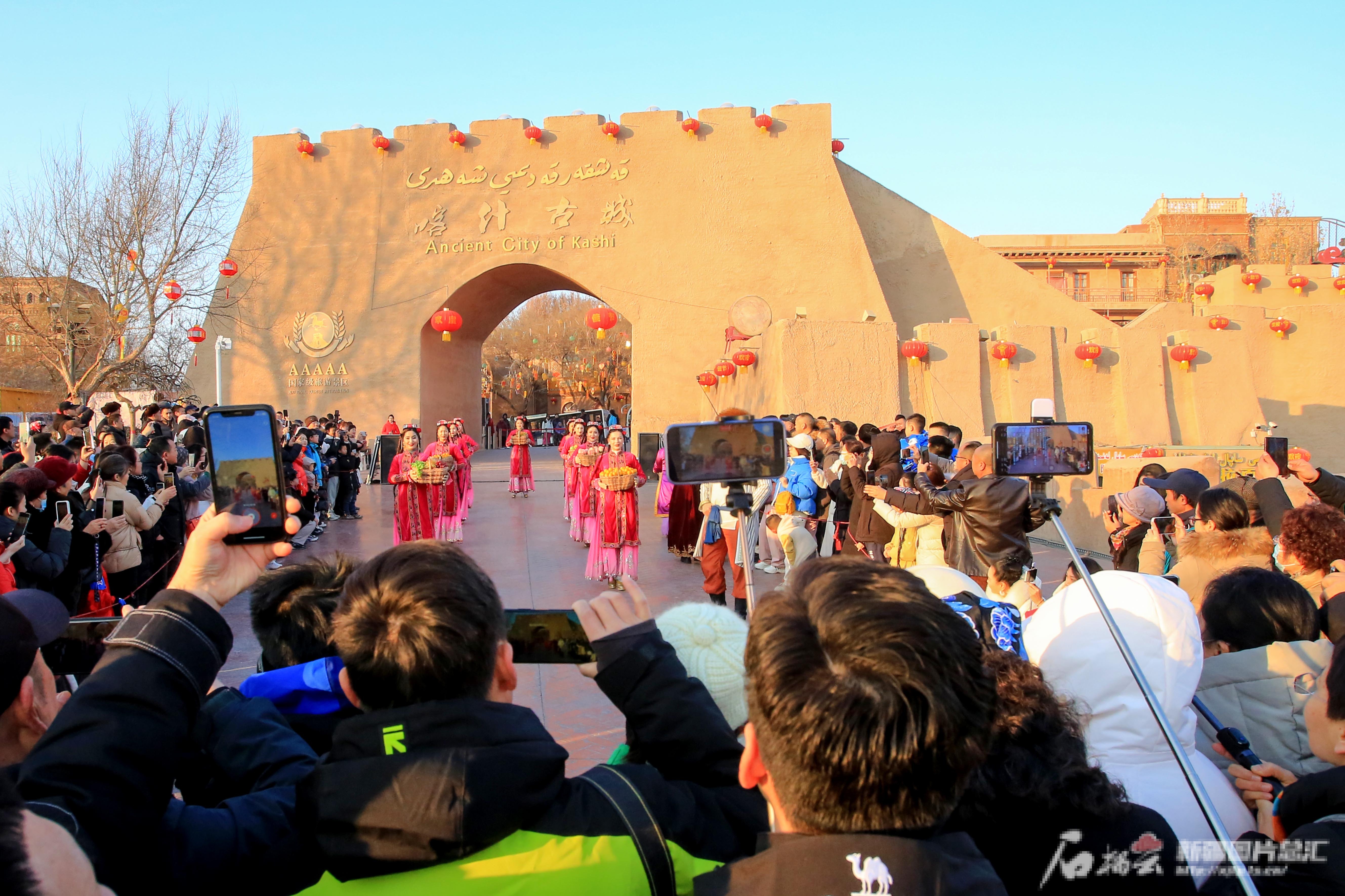 2月10日,游客在喀什古城景区观看入城仪式。