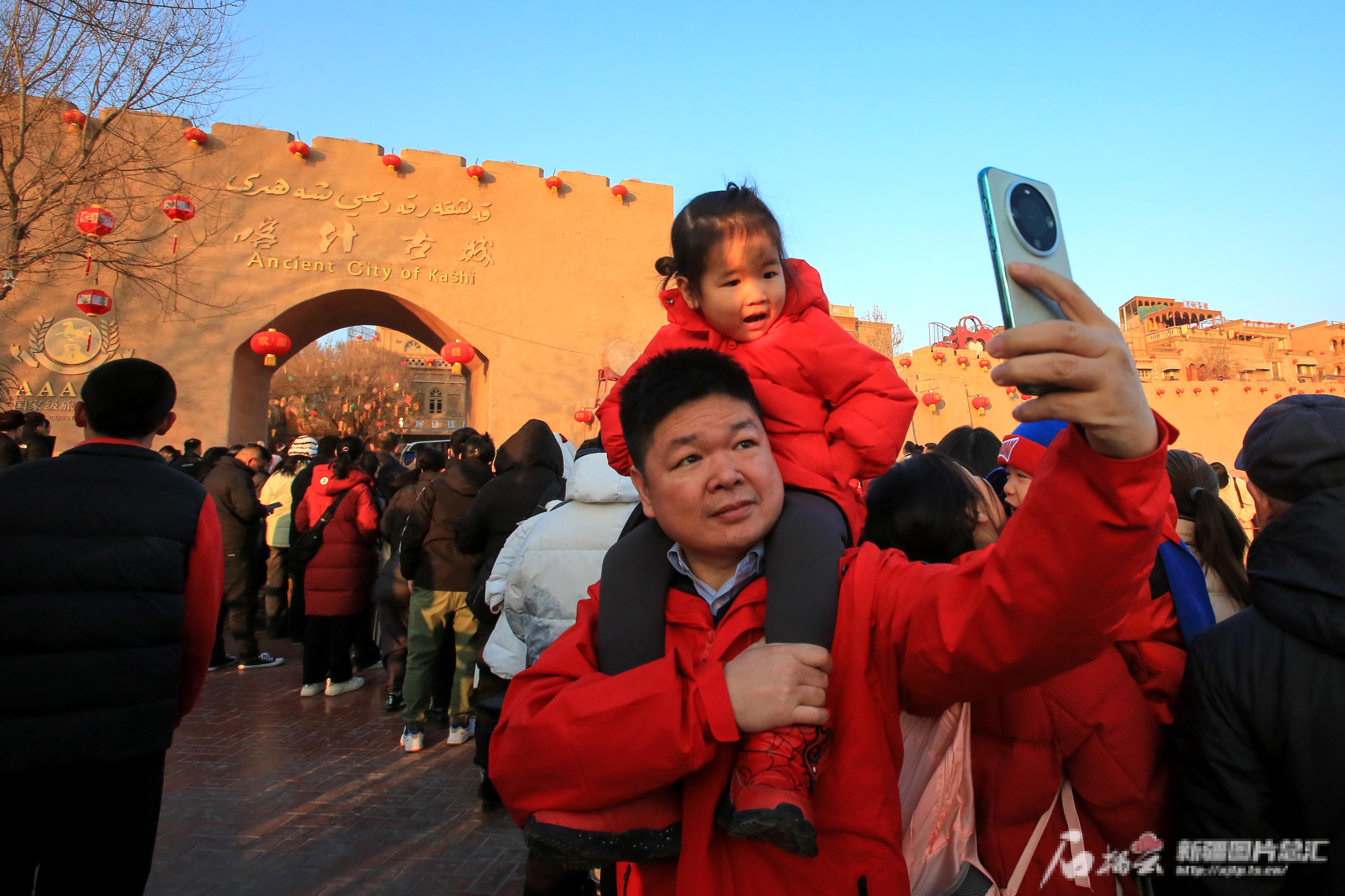 2月10日,游客在喀什古城景区拍照留念。
