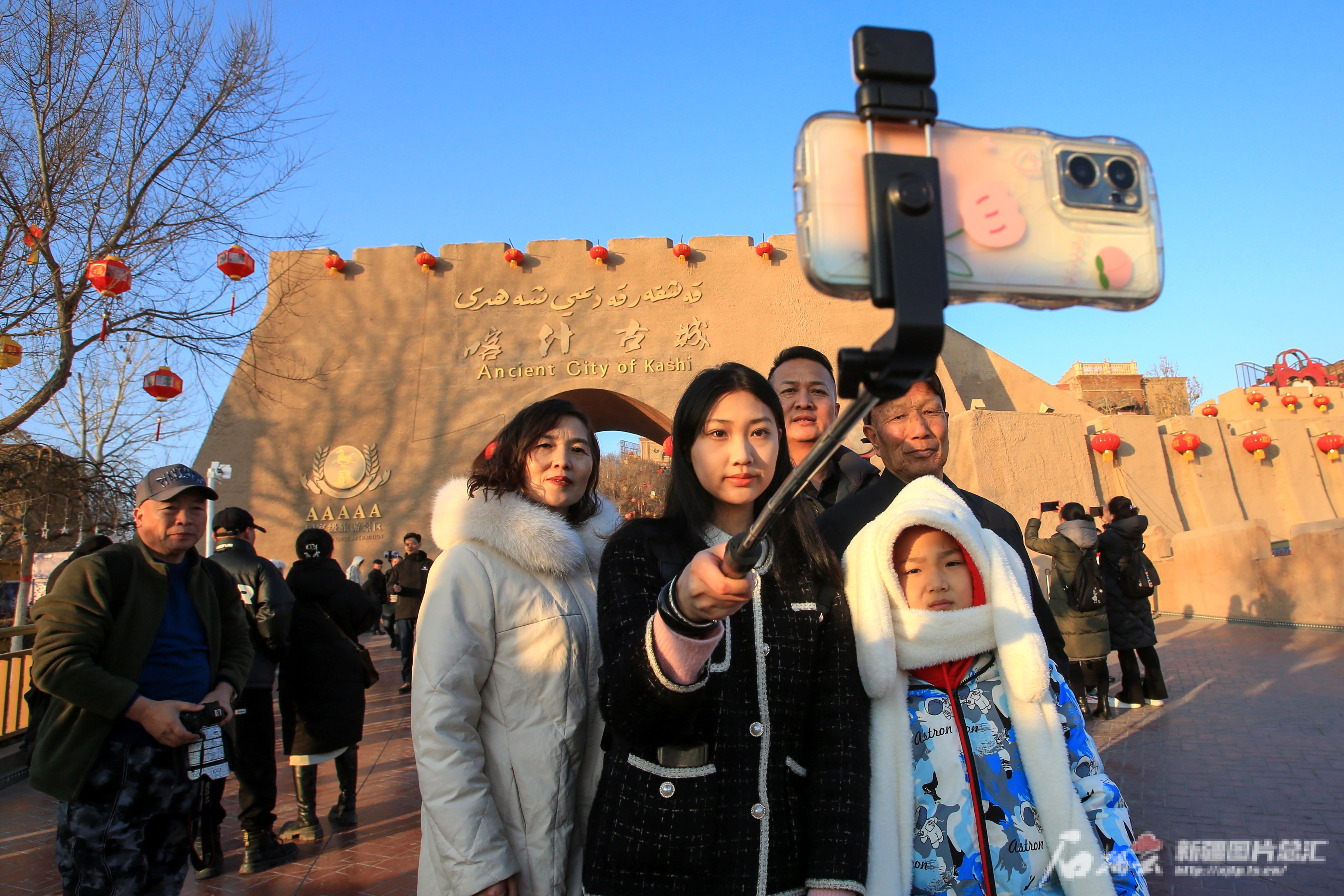 2月10日,游客在喀什古城景区自拍留念。