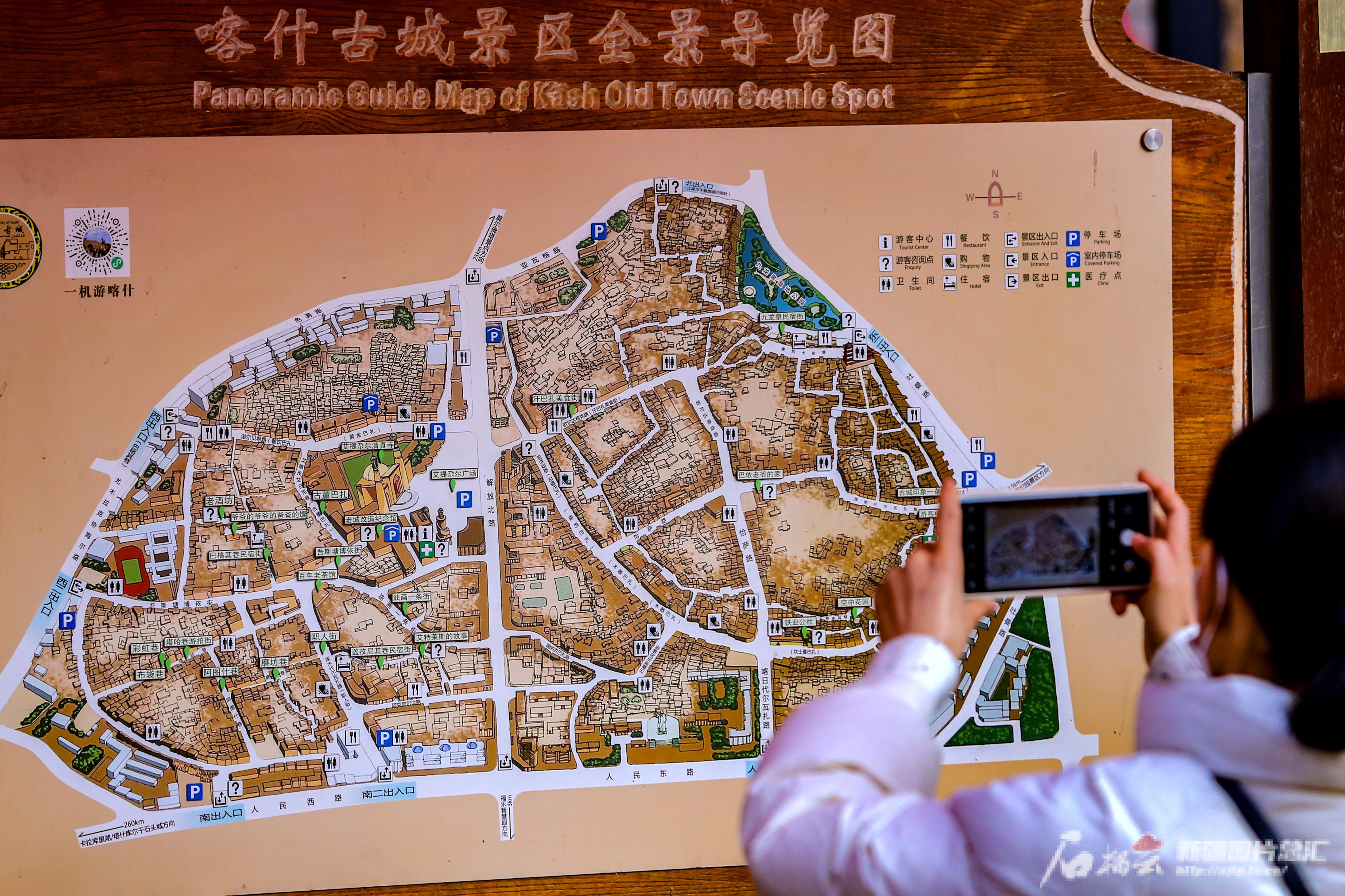 2月10日,游客在新疆喀什古城景区拍摄全景导览图。