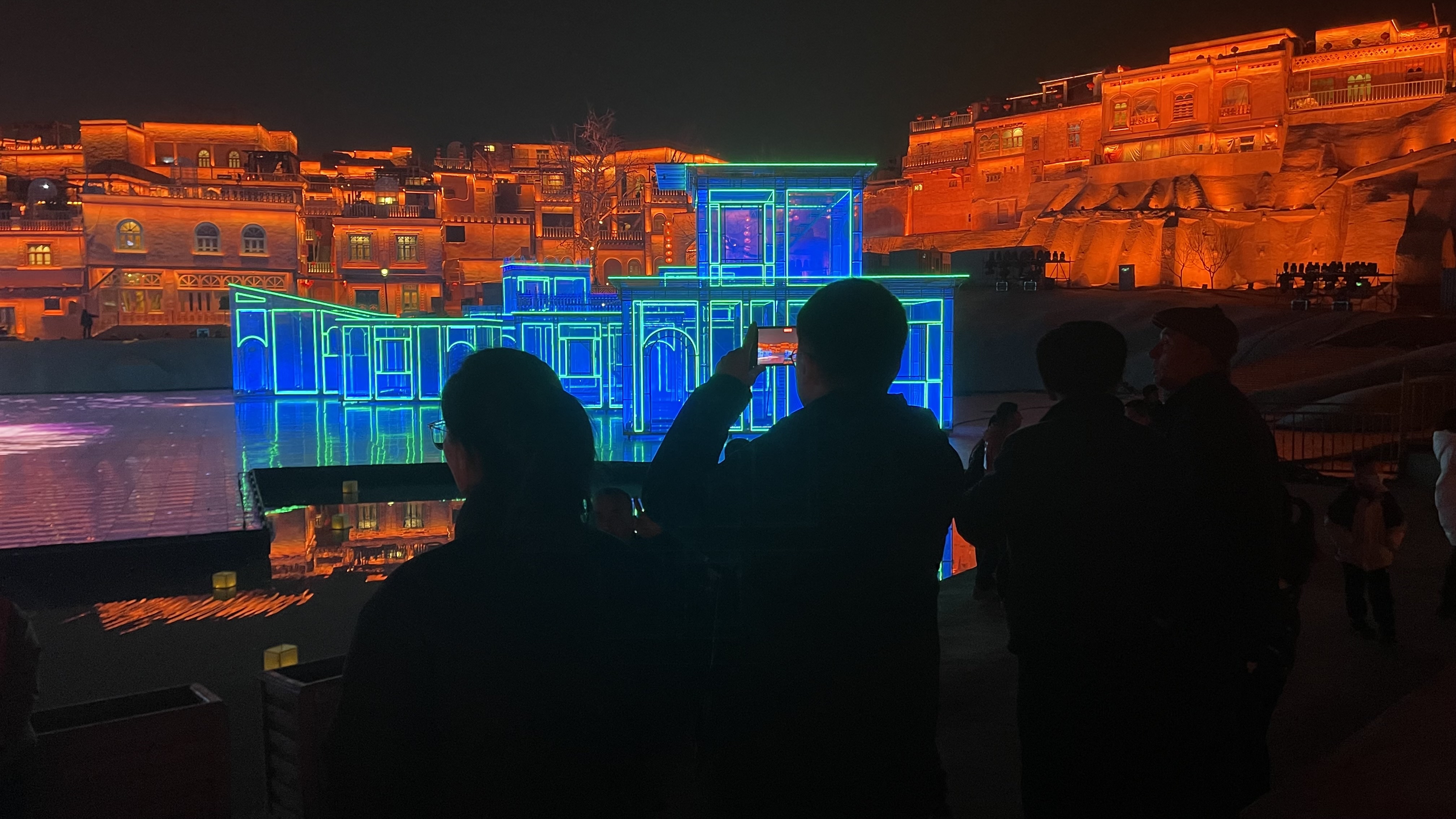 当夜幕降临灯光亮起,春晚喀什分会场主舞台与喀什古城民居在隔空交错中,炫出七彩光影。现场灯光还结合《千里万里》《喀什的夜》等歌曲进行卡点设计,千年古城变为浪漫舞台,广大市民和游客纷纷拿起手机、相机,与家人朋友一起定格这美丽的时刻。