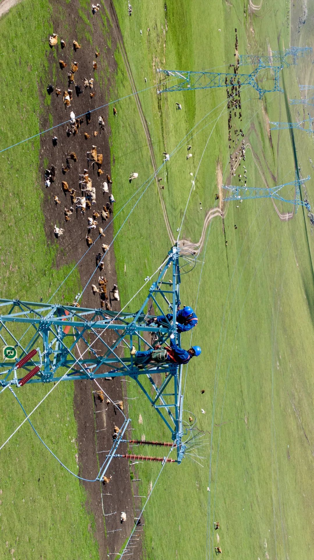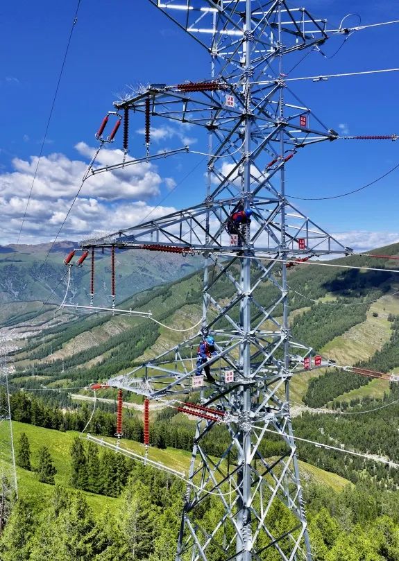 员工对喀纳斯、禾木景区高山段110千伏月云线进行巡视消缺。摄影师@努尔别克·努尔曼