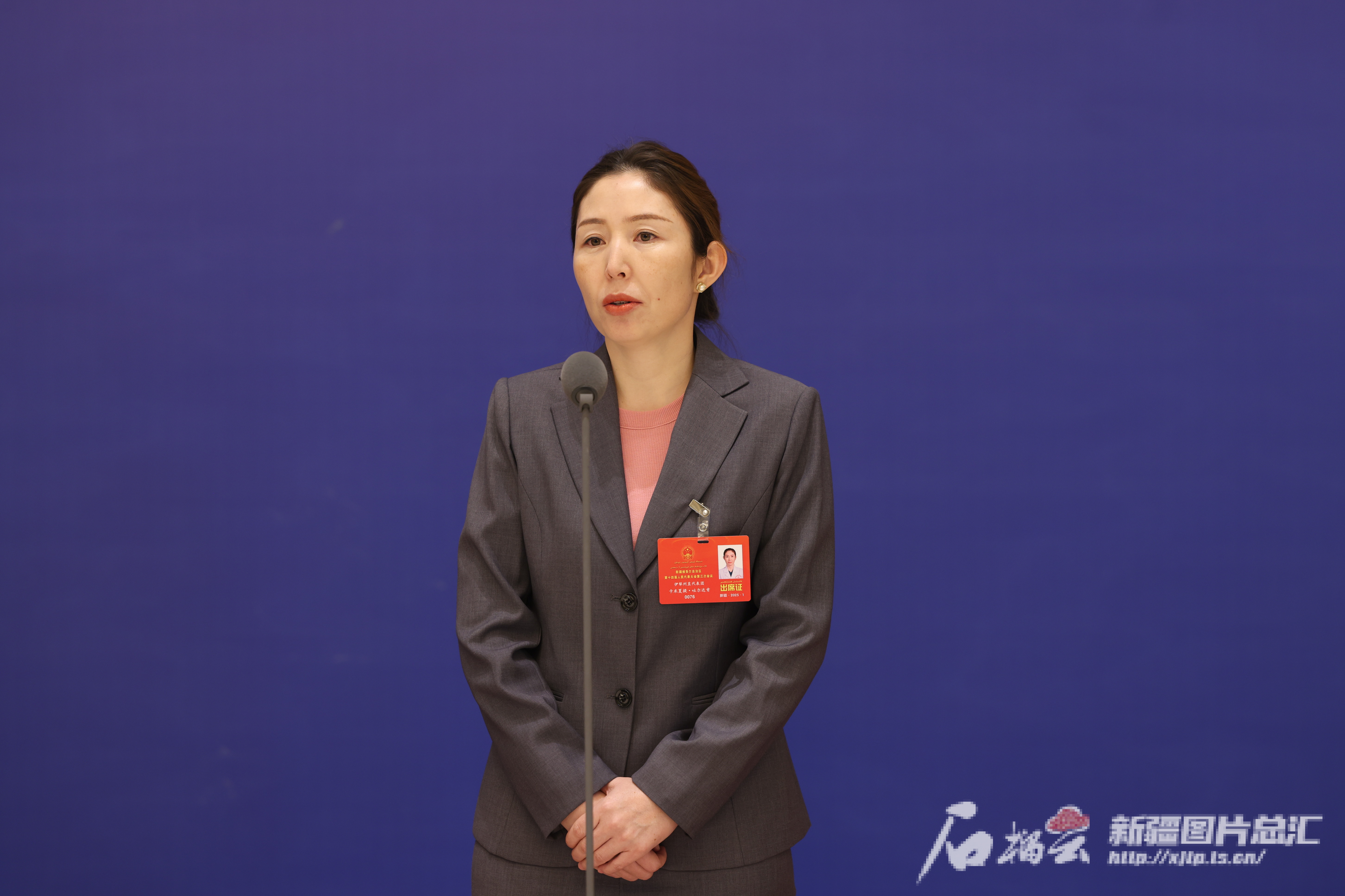 1月19日上午9时10分,自治区十四届人大三次会议“代表通道”集体采访活动在新疆人民会堂举行。图为人大代表卡米夏提·吐尔达肯答记者问。石榴云/新疆日报记者 李瑞摄