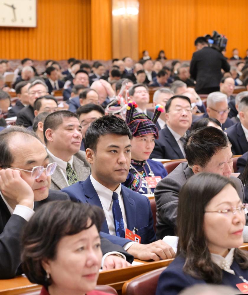 3月7日,海尼扎提·托呼提(二排中)在北京人民大会堂出席全国政协十四届三次会议第二次全体会议。李贺摄