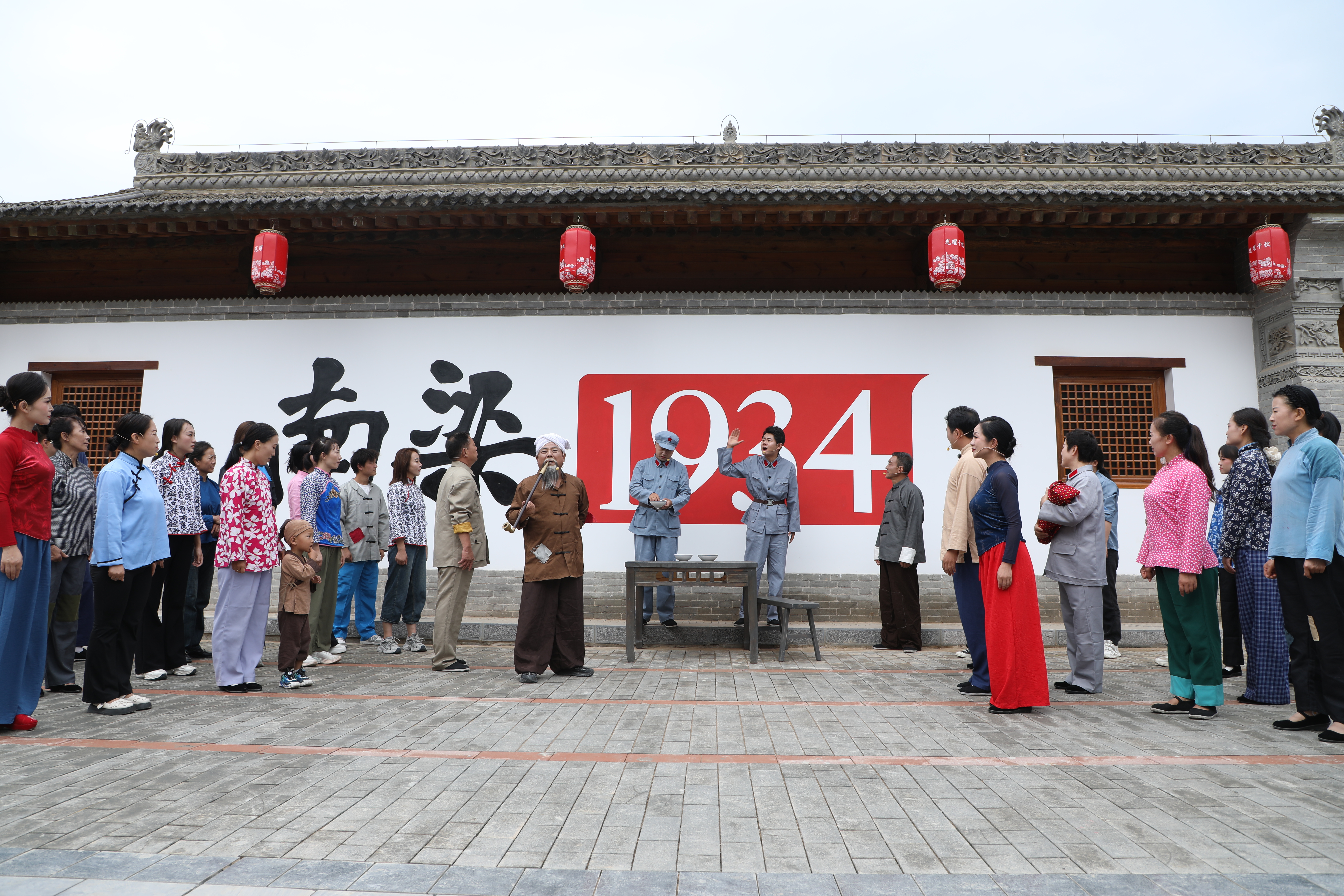 8月1日,演员们在长征国家文化公园南梁革命根据地核心展示园内进行革命故事表演。新华社记者张智敏 摄