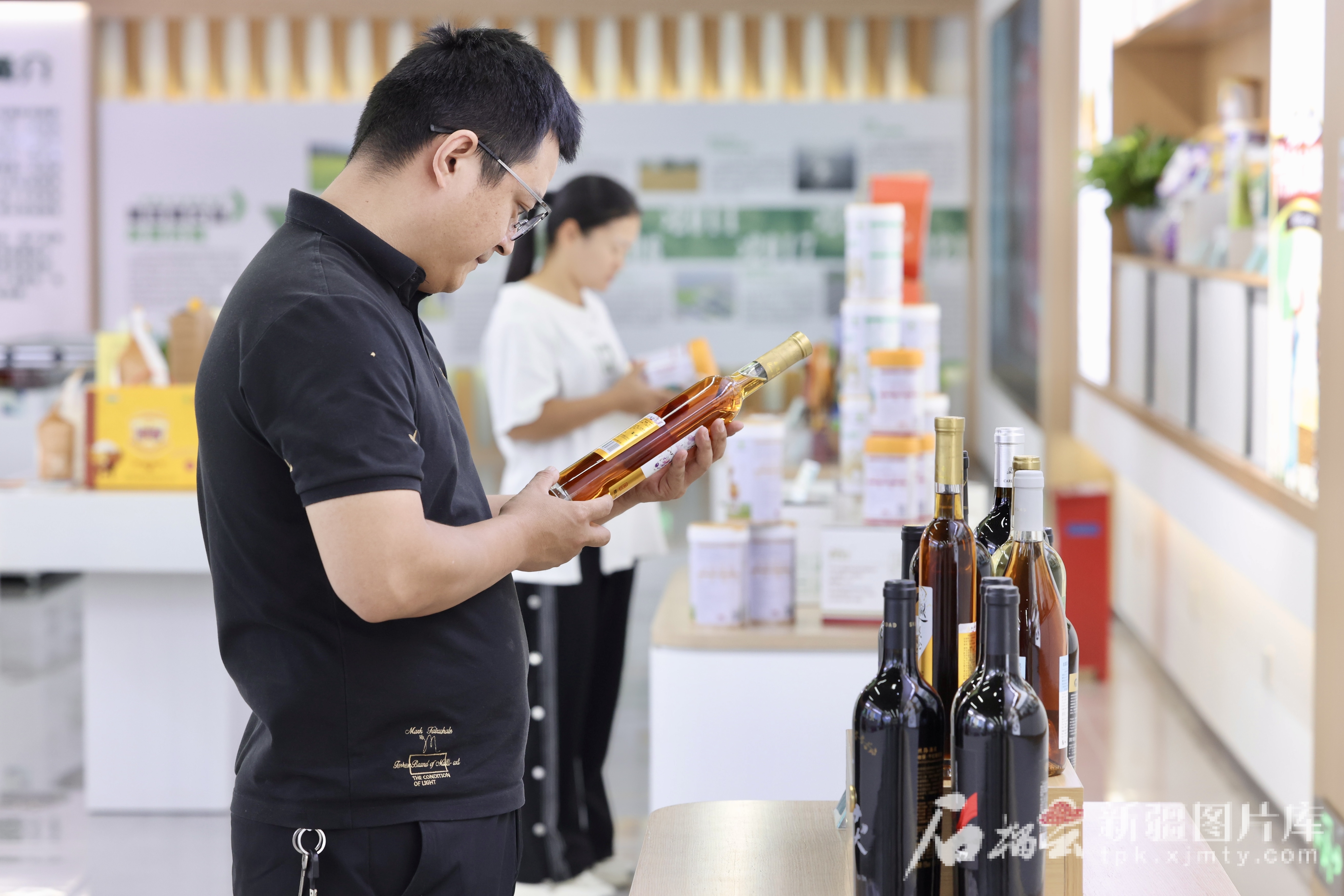 8月17日,游客在“润疆情”农特产品集中采购仓选购葡萄酒。