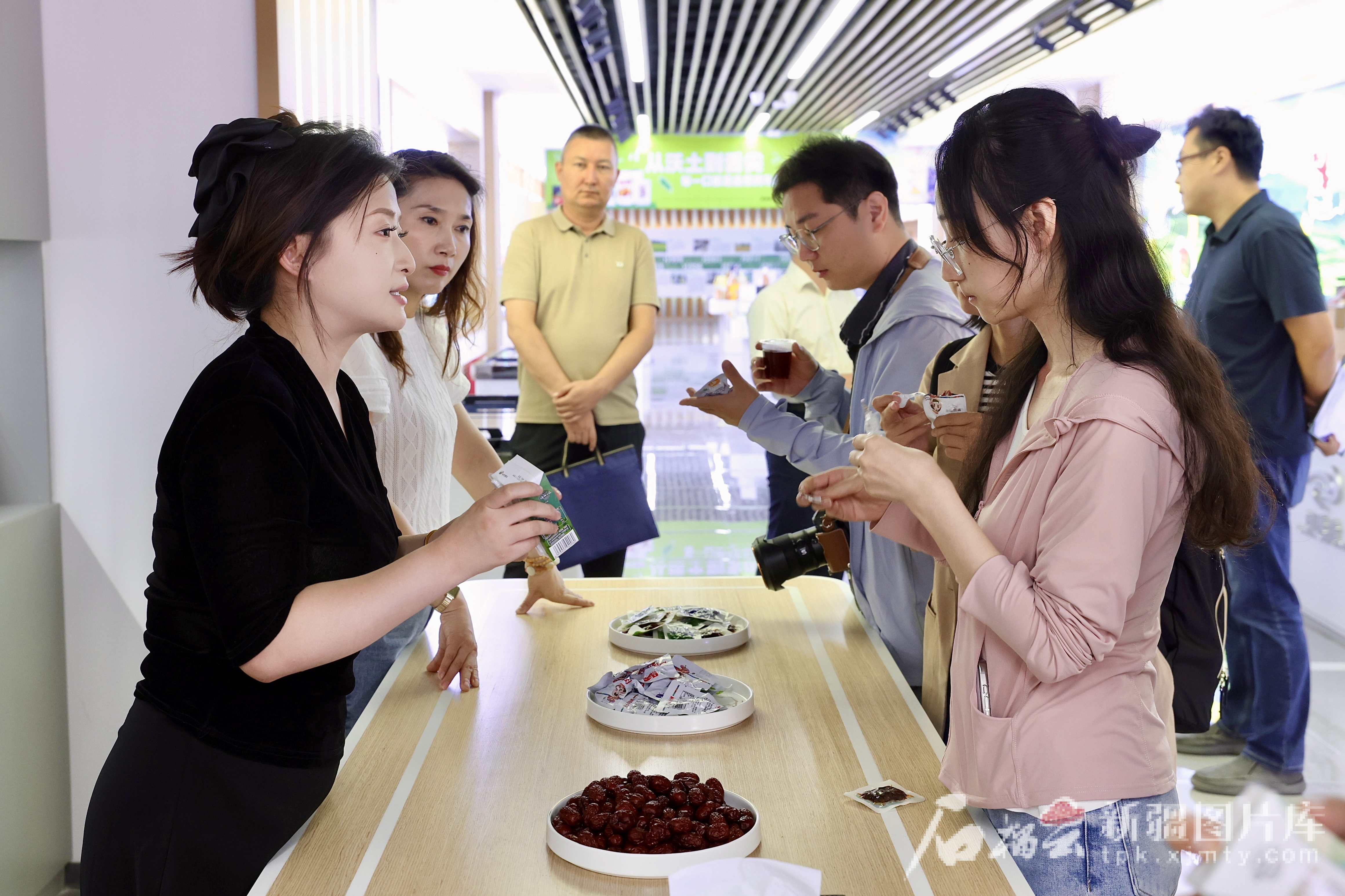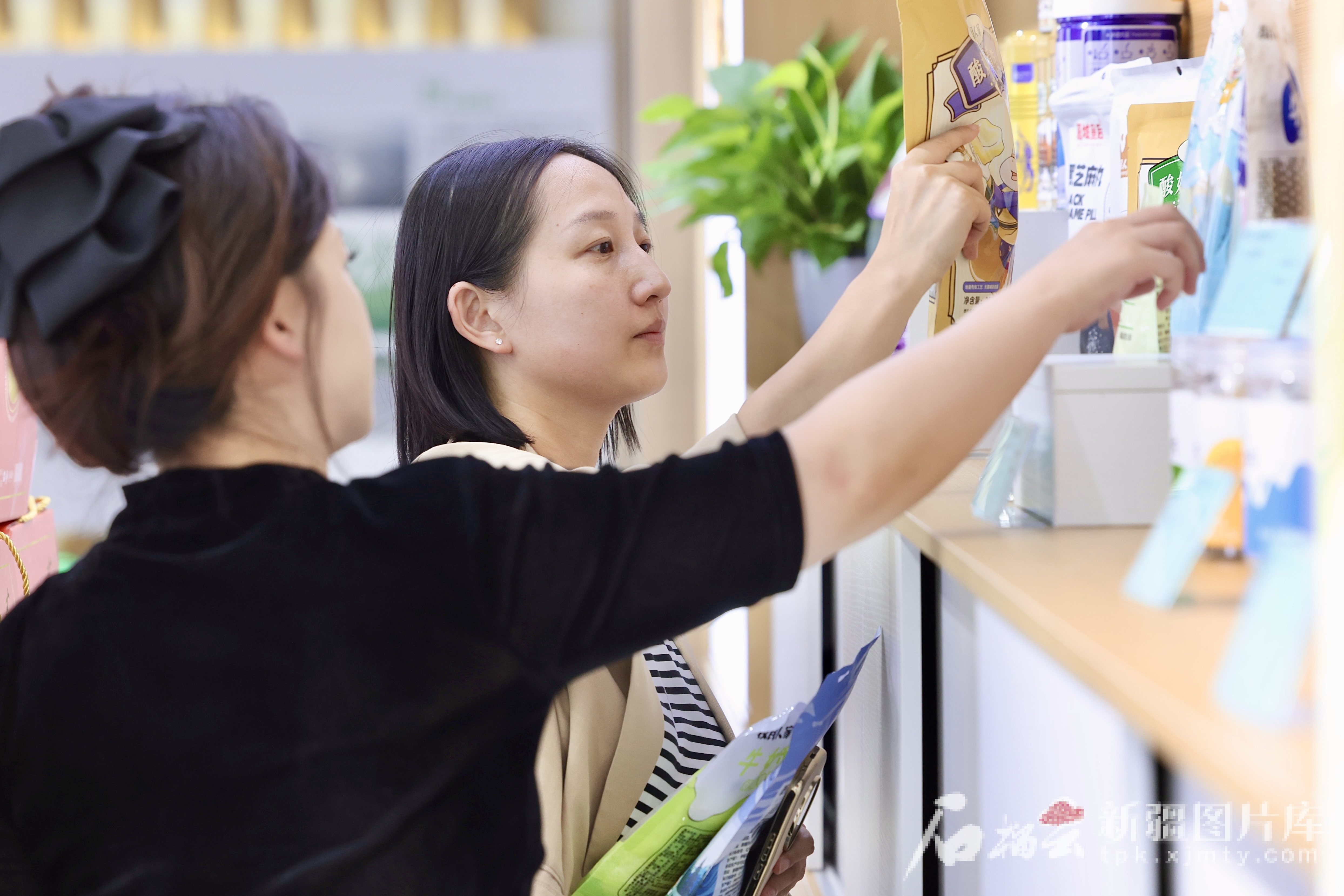 石榴云/新疆日报讯(记者 李瑞 摄影报道)8月17日,“对口援疆 潮涌天山”主题采访活动成员来到兵团第四师可克达拉市。当天,记者走进镇江援疆重点品牌项目——“润疆情”农特产品集中采购仓看到优质大米、鲜美牛羊肉、干果有序陈列在展示柜上,一旁还有试吃装的牛肉干、牛奶等,吸引了不少游客前来选购。