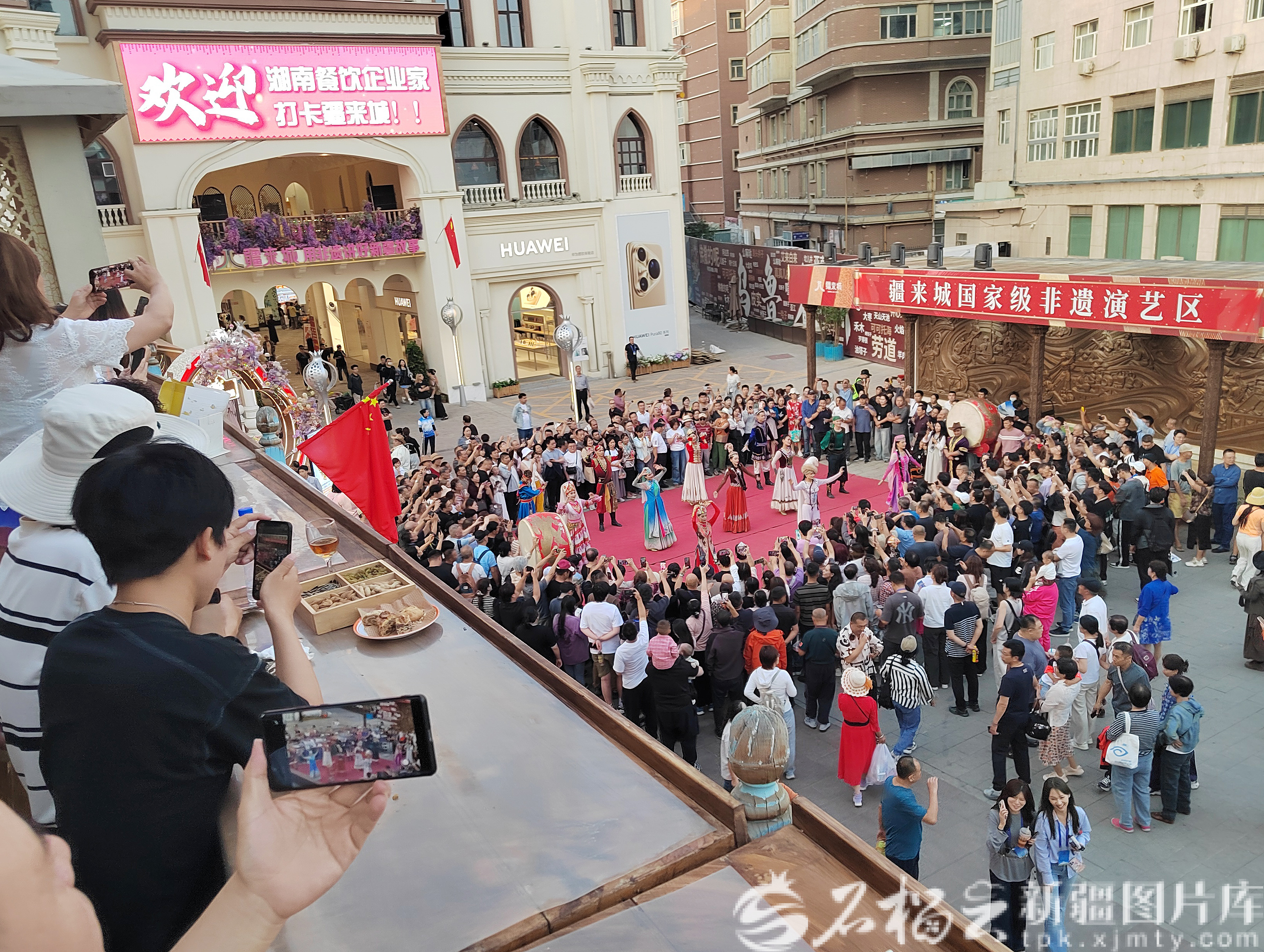 9月8日,游客观看、拍摄新疆国际大巴扎疆来城的文艺表演。