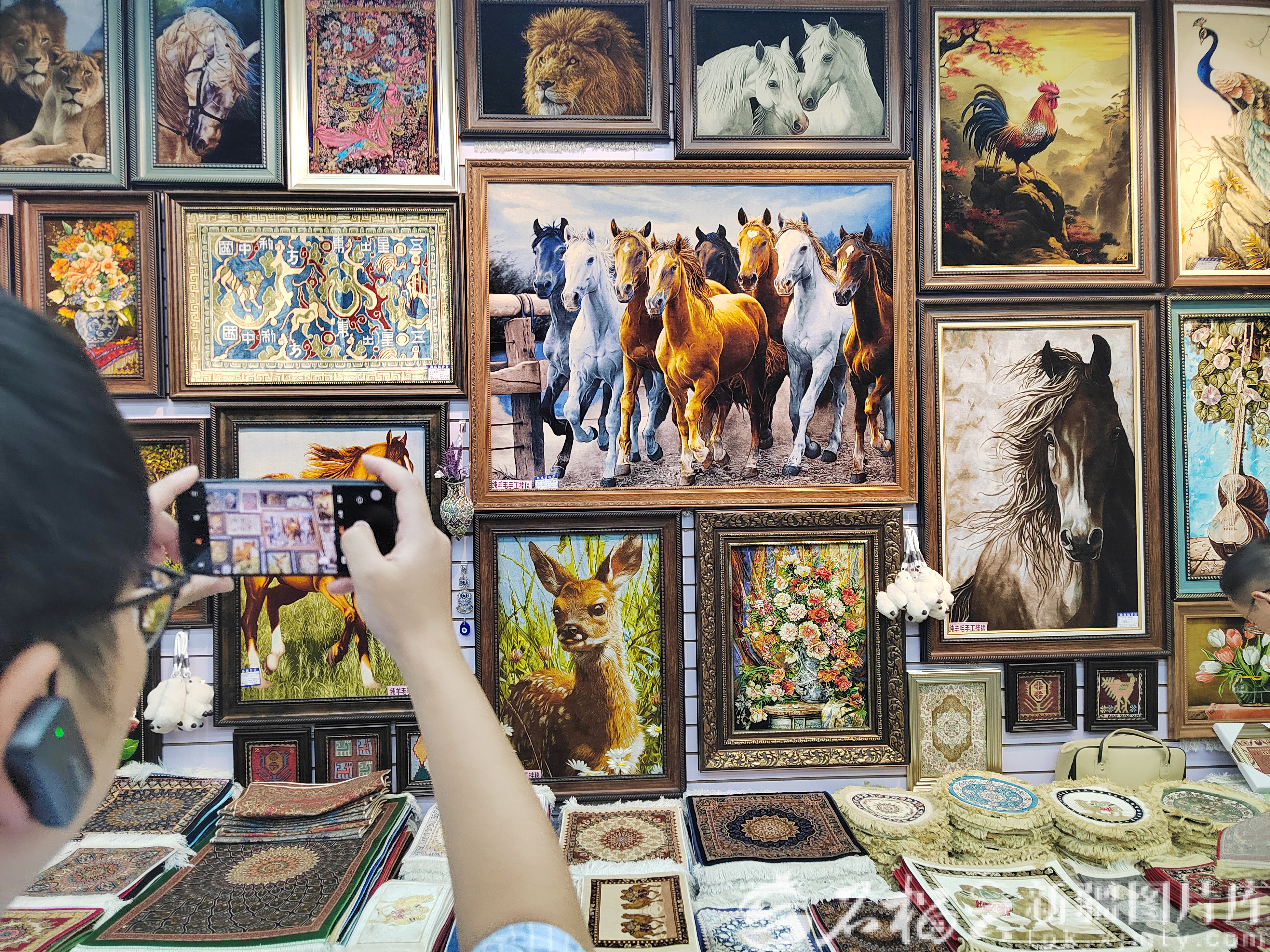 9月8日,采访团成员在新疆国际大巴扎疆来城金胡杨地毯店拍摄精美的地毯画。