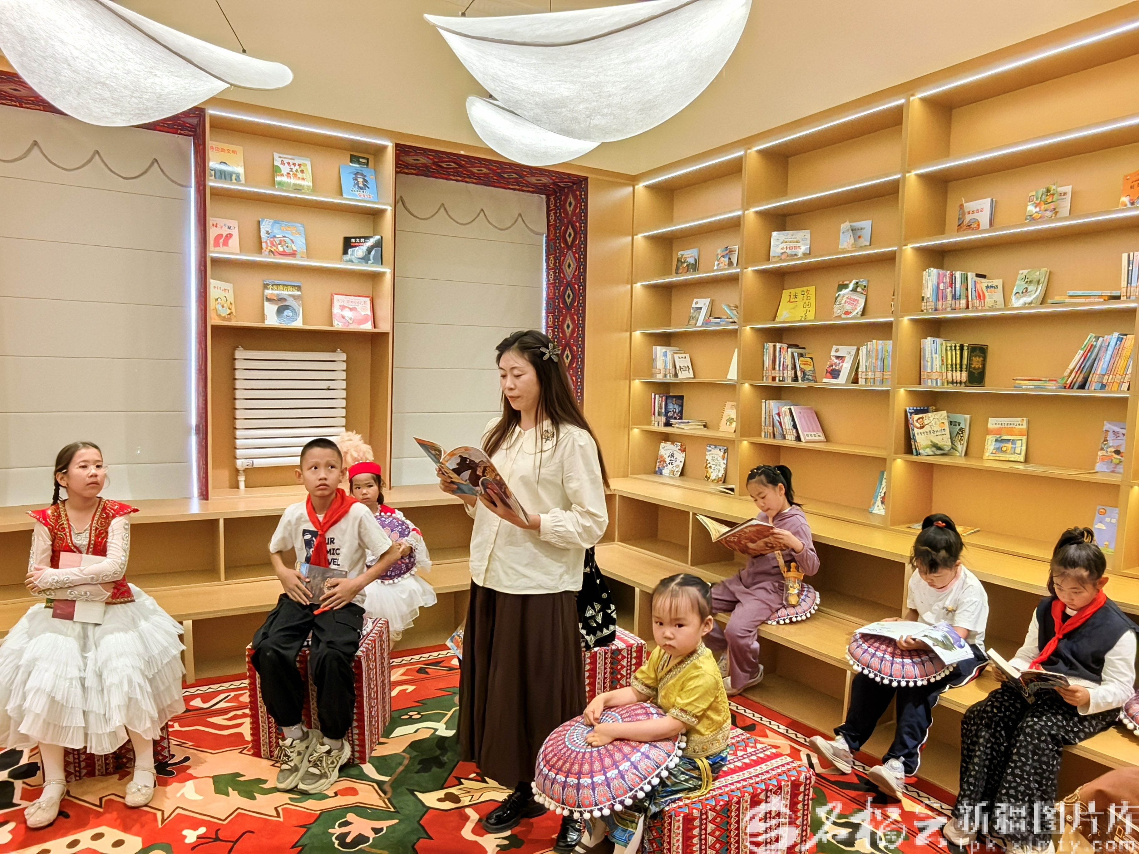 9月13日,小朋友们在“丝绸之路”新疆·塔城文学馆,听老师讲故事。
