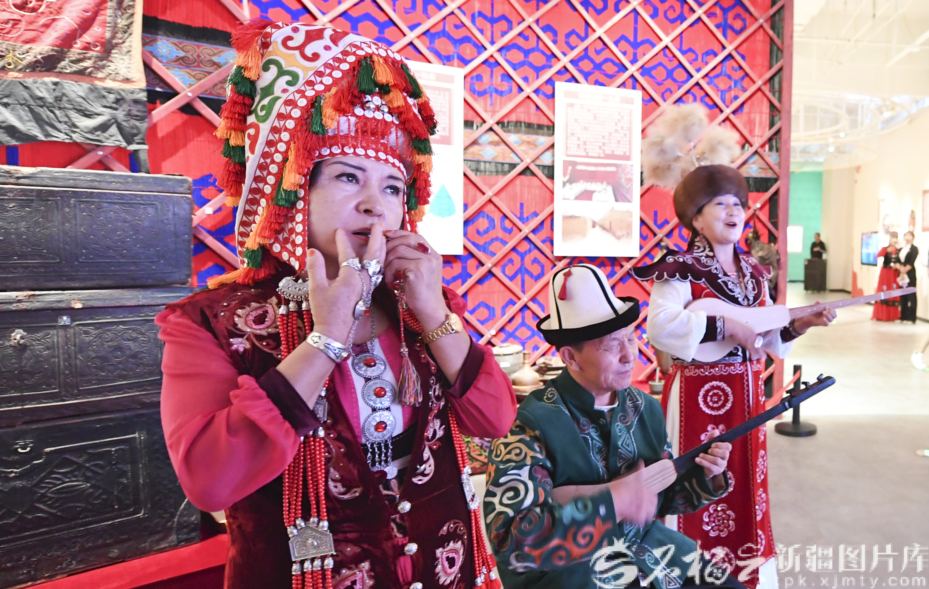 9月12日,民间艺人为参观者弹唱《玛纳斯》。