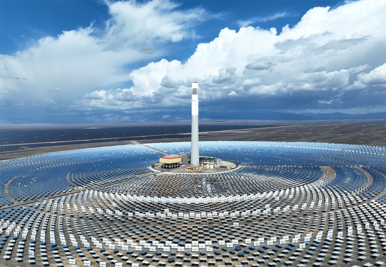国家电投新疆吐鲁番1GW光热+光伏一体化项目现场(8月20日无人机摄)。目前,吐鲁番电网总装机容量达1234.2万千瓦,其中新能源装机占比超70%。 刘健摄