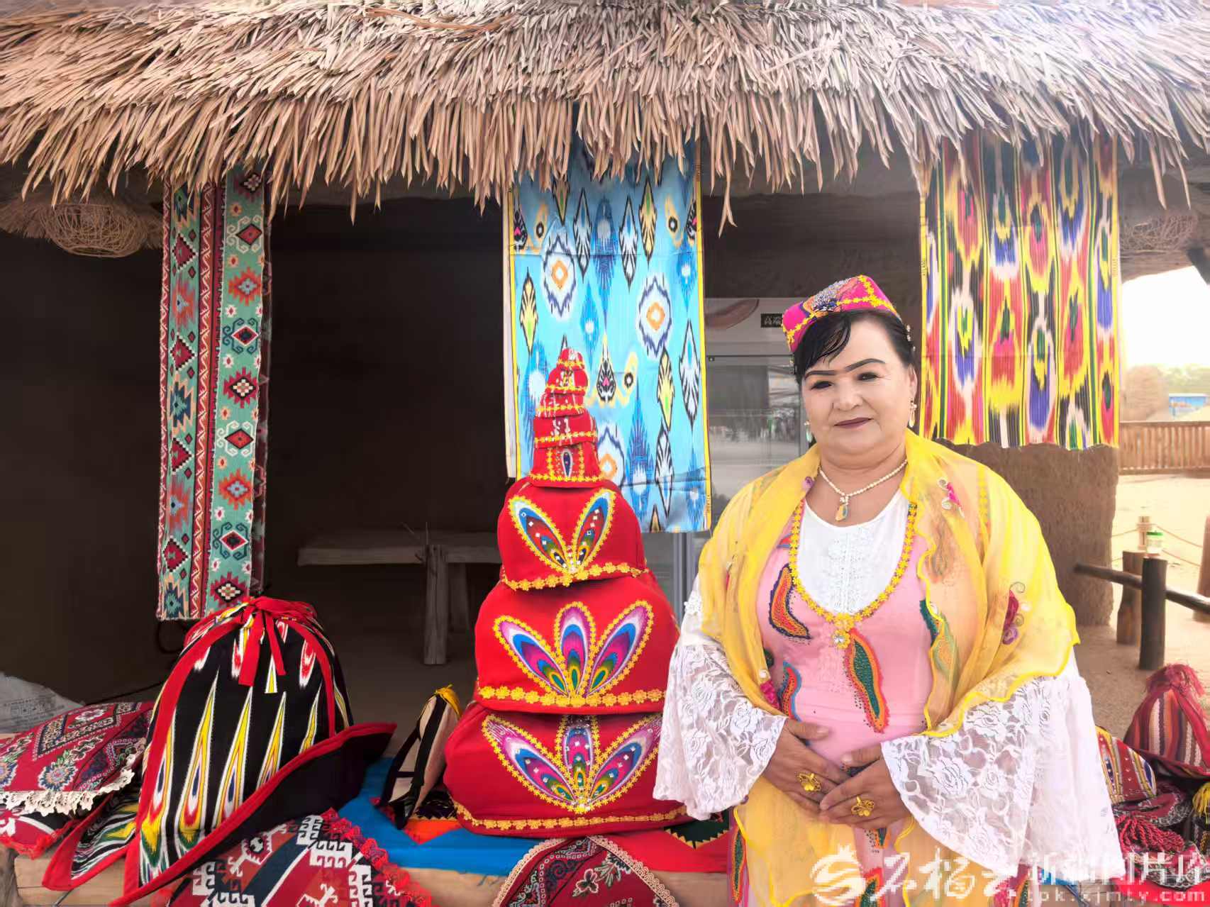 9月14日,在罗布人村寨景区,阿衣线木·尼扎尔在自家手工艺品档口前,展示自制的绣品。图/尉犁县融媒体中心提供