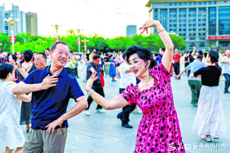 7月3日傍晚,乌鲁木齐市南湖市民广场热闹如常,各族市民与游客伴着欢快的音乐翩翩起舞,其乐融融。孙振嵩摄