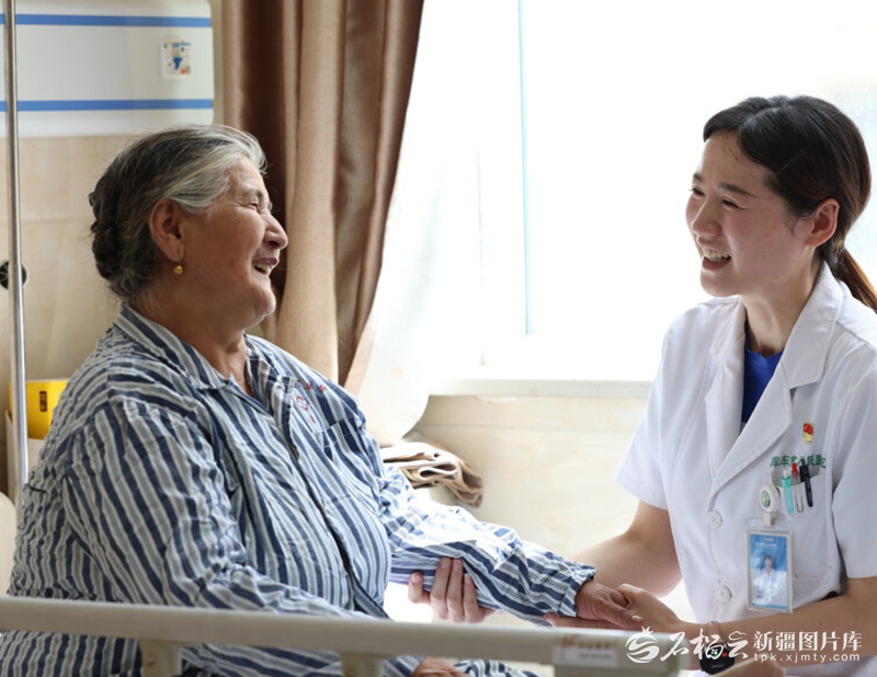 库车市人民医院医护人员在病房和患者交流,鼓励患者积极配合治疗(2023年8月17日摄)。袁欢欢摄