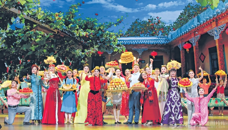 9月24日晚,庆祝新疆维吾尔自治区成立70周年文艺晚会《美丽新疆》在乌鲁木齐文化中心大剧院举行。图为节目《天山青松根连根》《燃情岁月》《我的爱献给祖国母亲》。天山网-新疆日报记者蔡增乐、汤永摄
