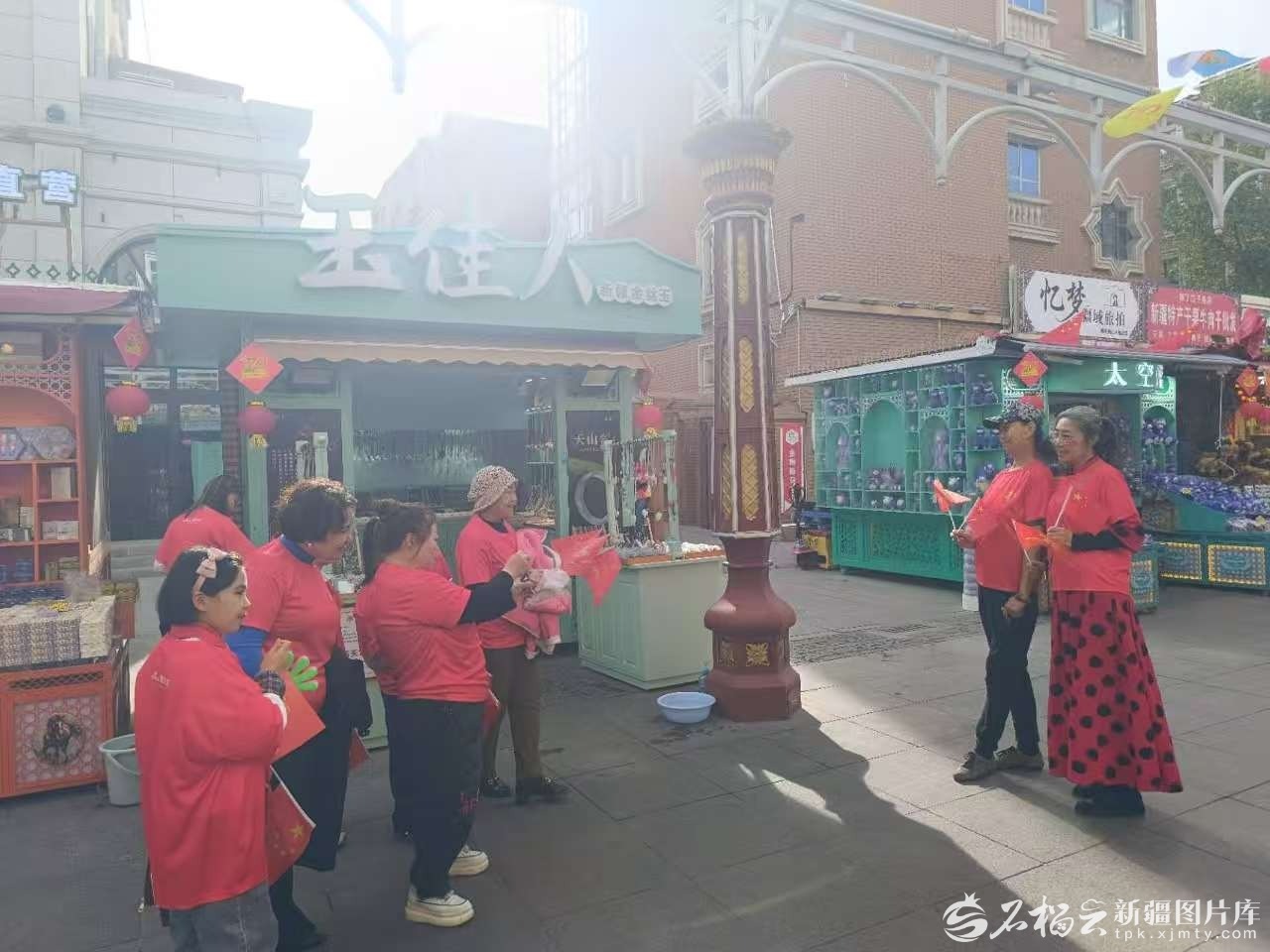 在步行街上,人潮涌动,随处可以看到手里挥动着国旗的游客、市民,他们并不相识,但是心愿都是同一个:祝福祖国繁荣昌盛。来自四川的游客张昊然和同伴们,原本正在挑选手鼓,忽然身边有人齐唱《我和我的祖国》——原来是大巴扎步行街举行的“我把新疆唱给你听”快闪活动。很快,他们就加入合唱的队伍,“在‘歌舞之乡’唱这首歌,感觉每个音符都带着葡萄干的甜蜜!”他说,在新疆旅游,最让他们感动的,就是“感受新疆的团结氛围”,“互不相识的游客与当地人在一起,挥动国旗齐声高歌的场景,太感人了!”