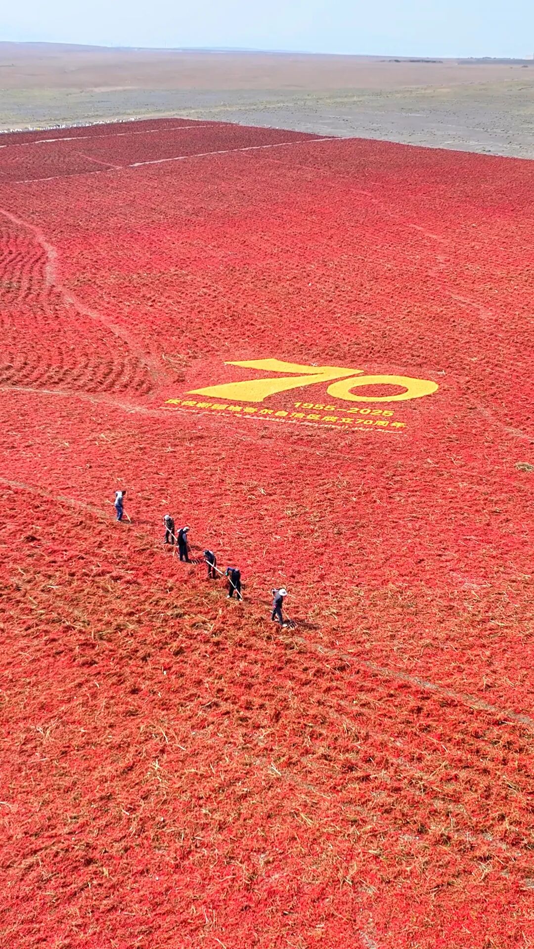 9月23日,沙湾市安集海镇干部群众用农作物摆出庆祝新疆维吾尔自治区成立70周年祝福字样。
