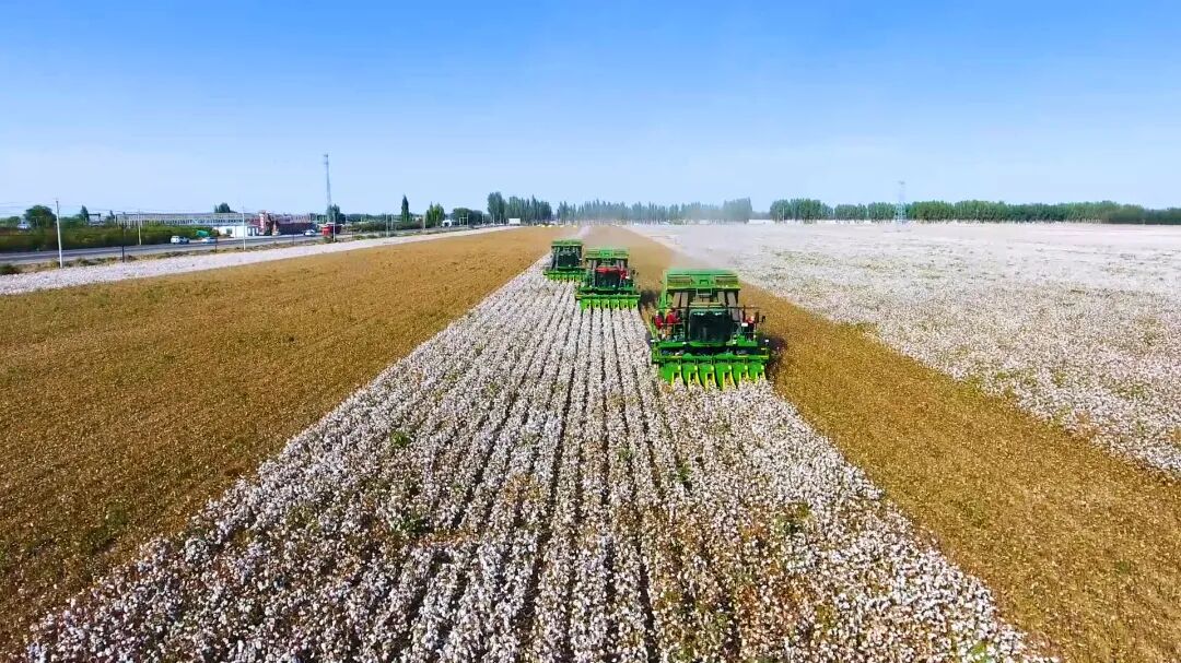 大型机械穿梭在棉田中,收获丰收的喜悦。