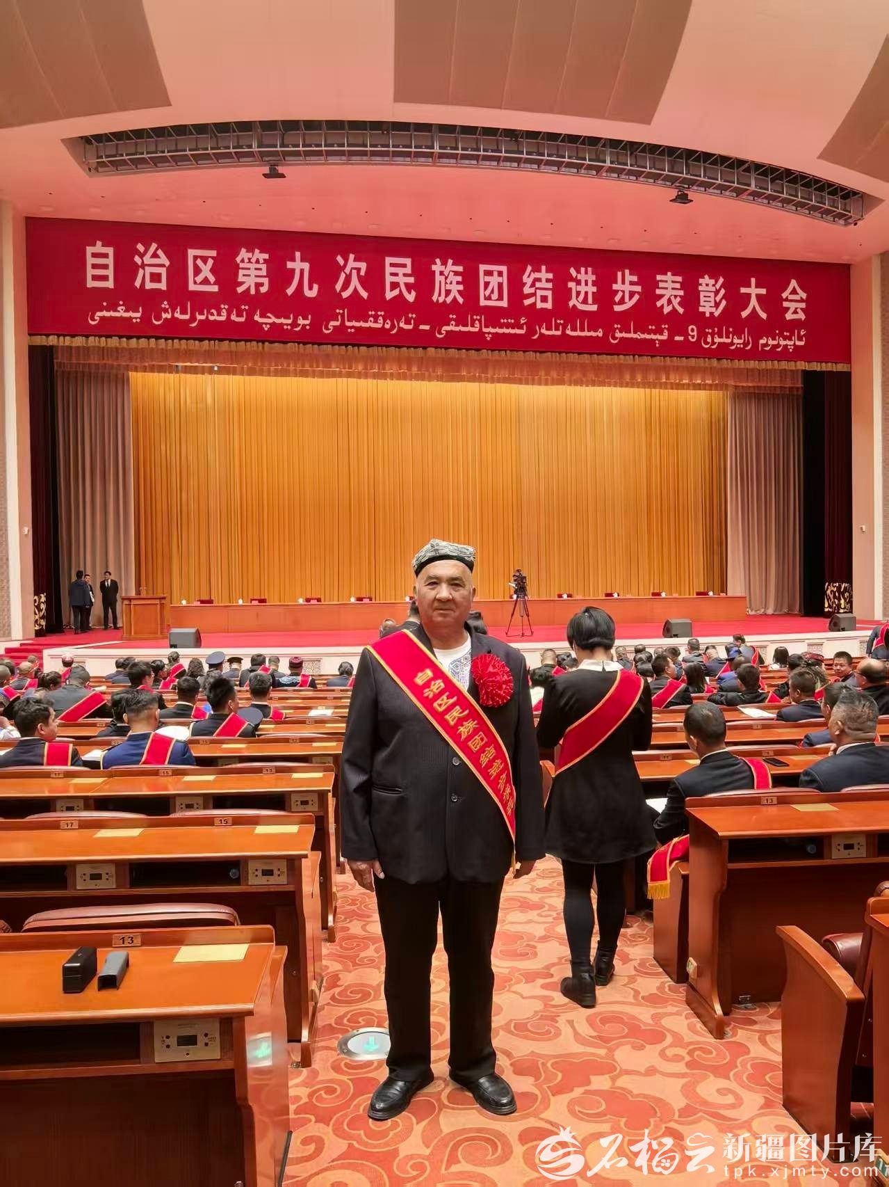 10月16日,乌鲁木齐市水磨沟区苇湖梁街道昌盛祥社区居民艾力·克依木在自治区第九次民族团结进步表彰大会现场。图片由本人提供
