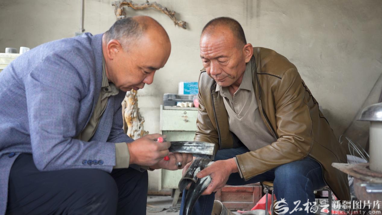 10月15日,叶力江·巴特尔汗(左)与逯永成一起构思创作骨雕作品。哈拉哈提 摄